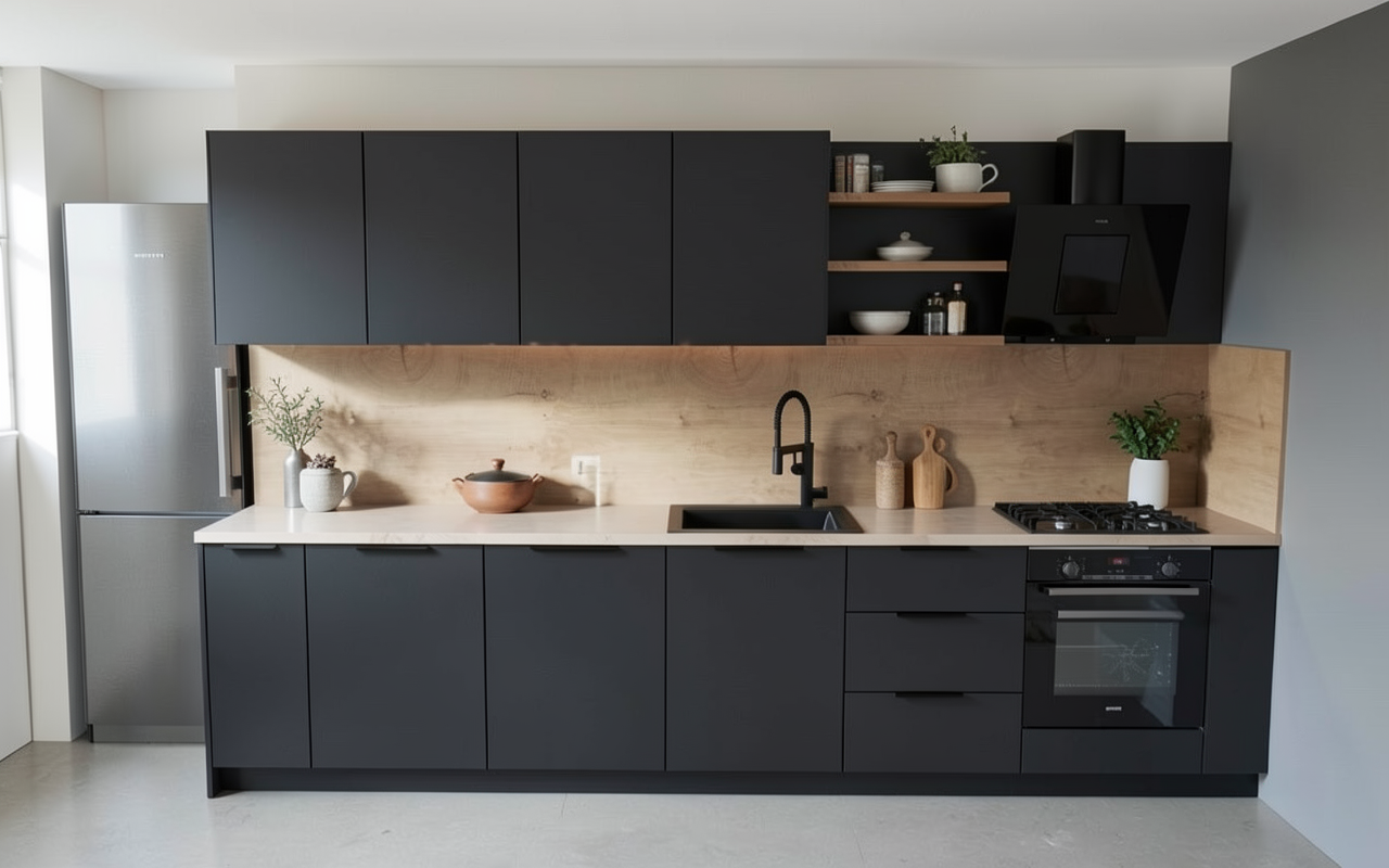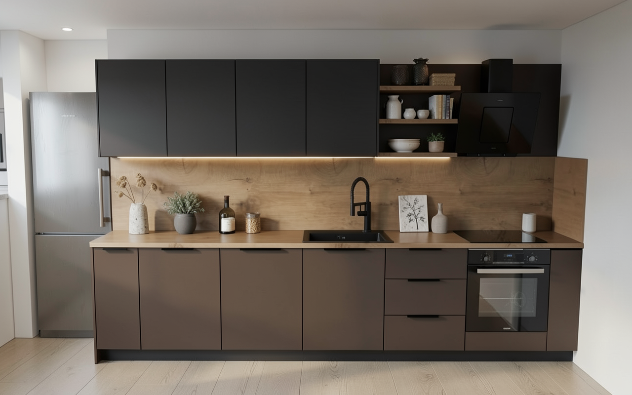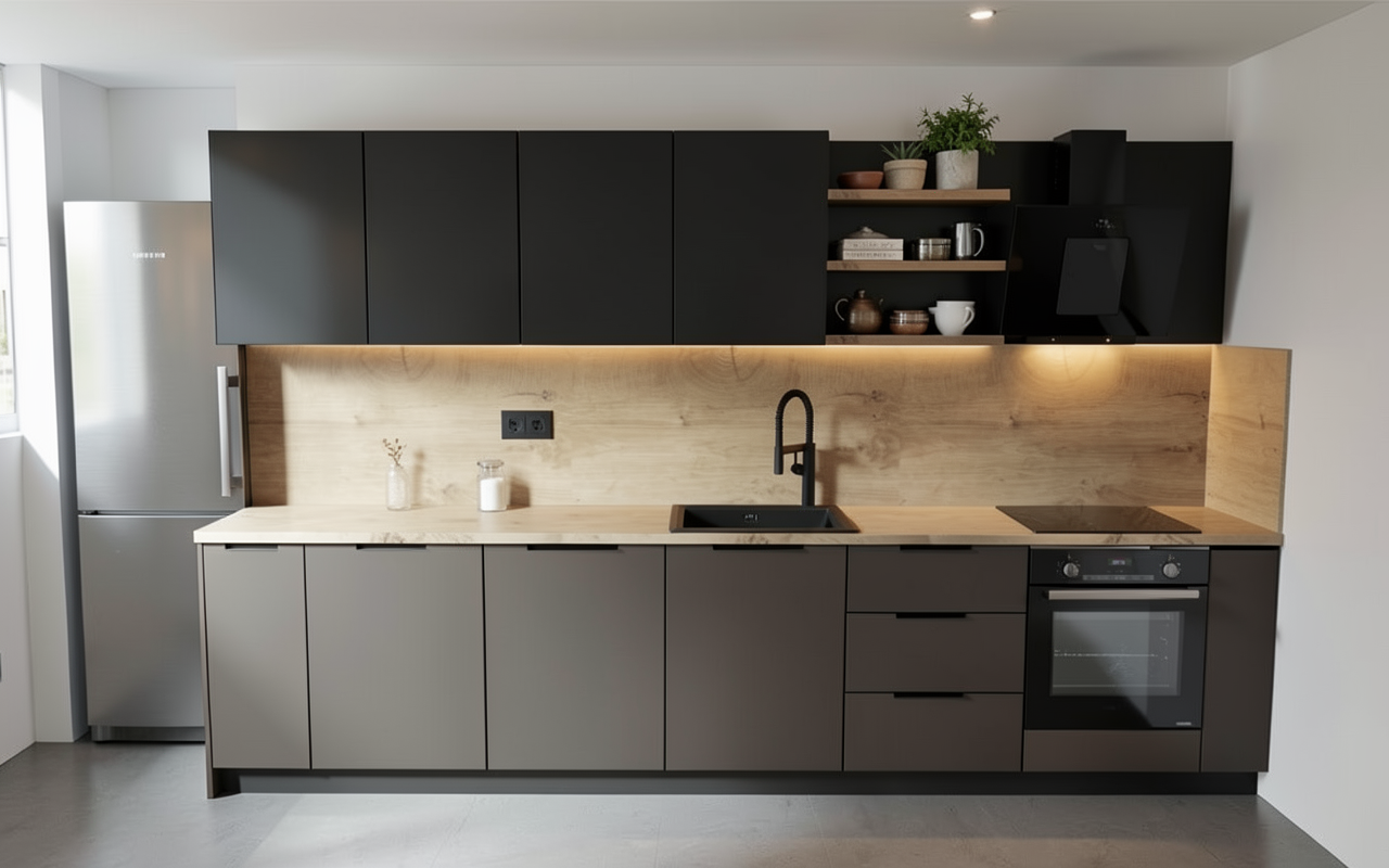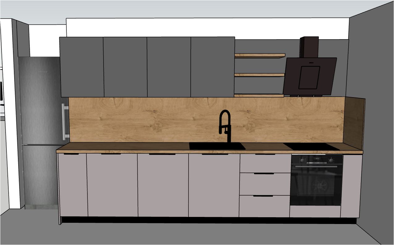 wall cabinets are dark gray almost black extractor is black put some accesoiries on the shelves down cupboards are color gray capuchino