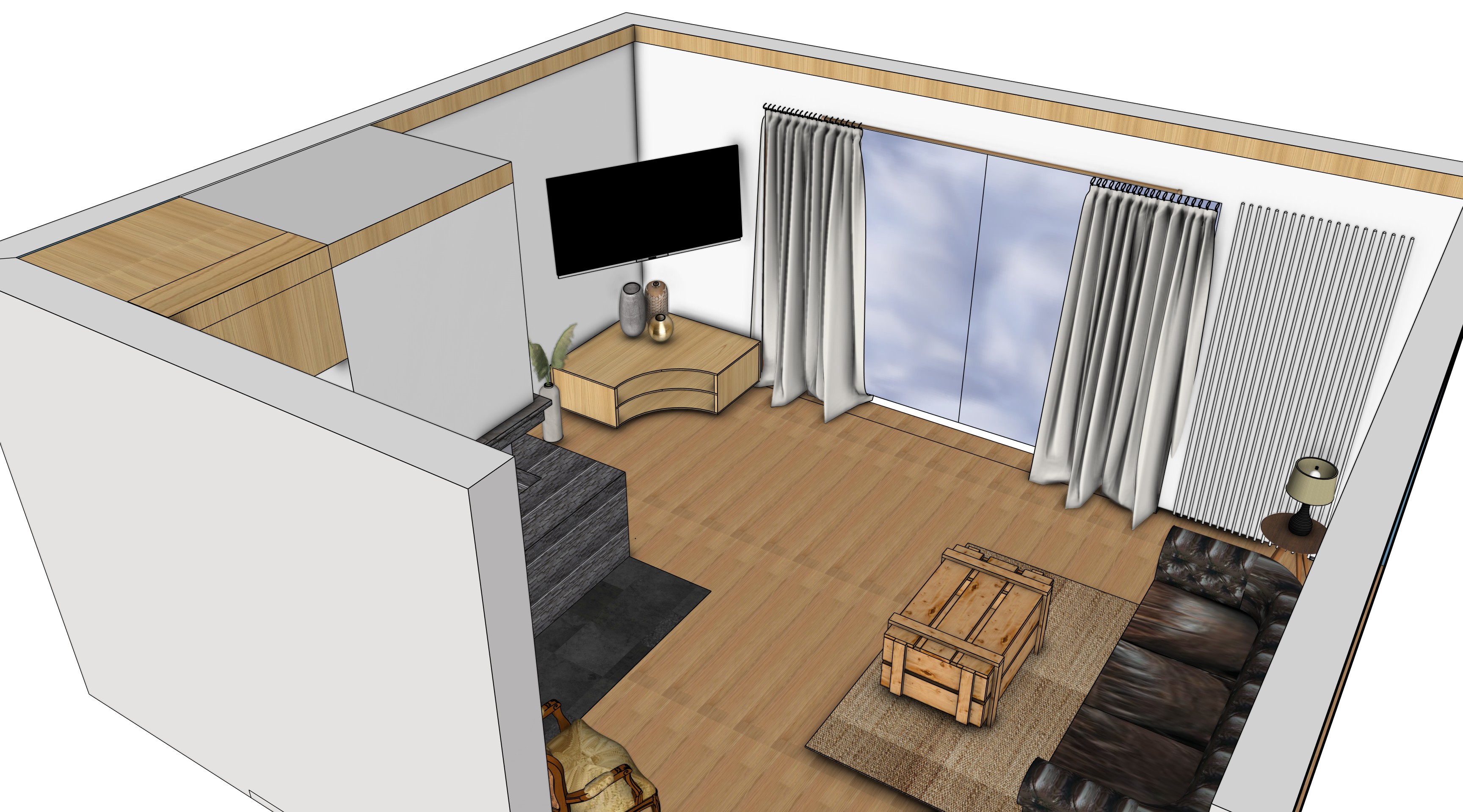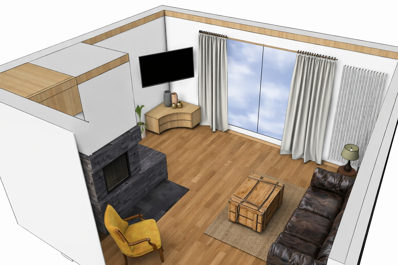 salon sol parquet en ch ne chemin e en pierre noire vitr e sur la droite murs blancs meuble d angle en bois sous la tv canap cuir marron vintage chaise jaune