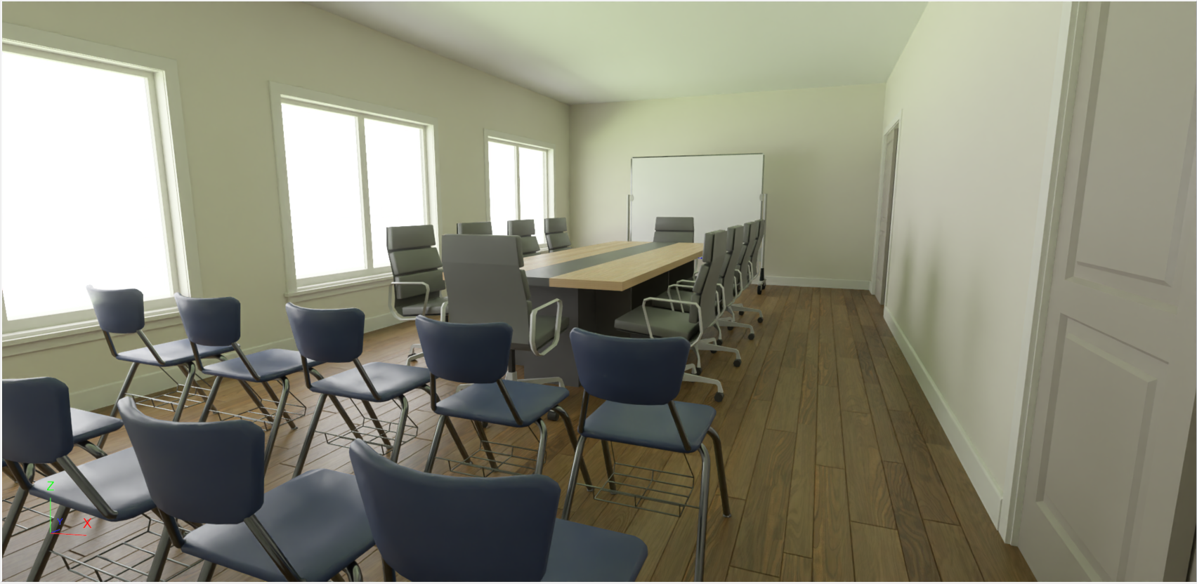 functionalism exterior shot remove the cabinet on the back put projector board on the back change the color of chair to black architecture