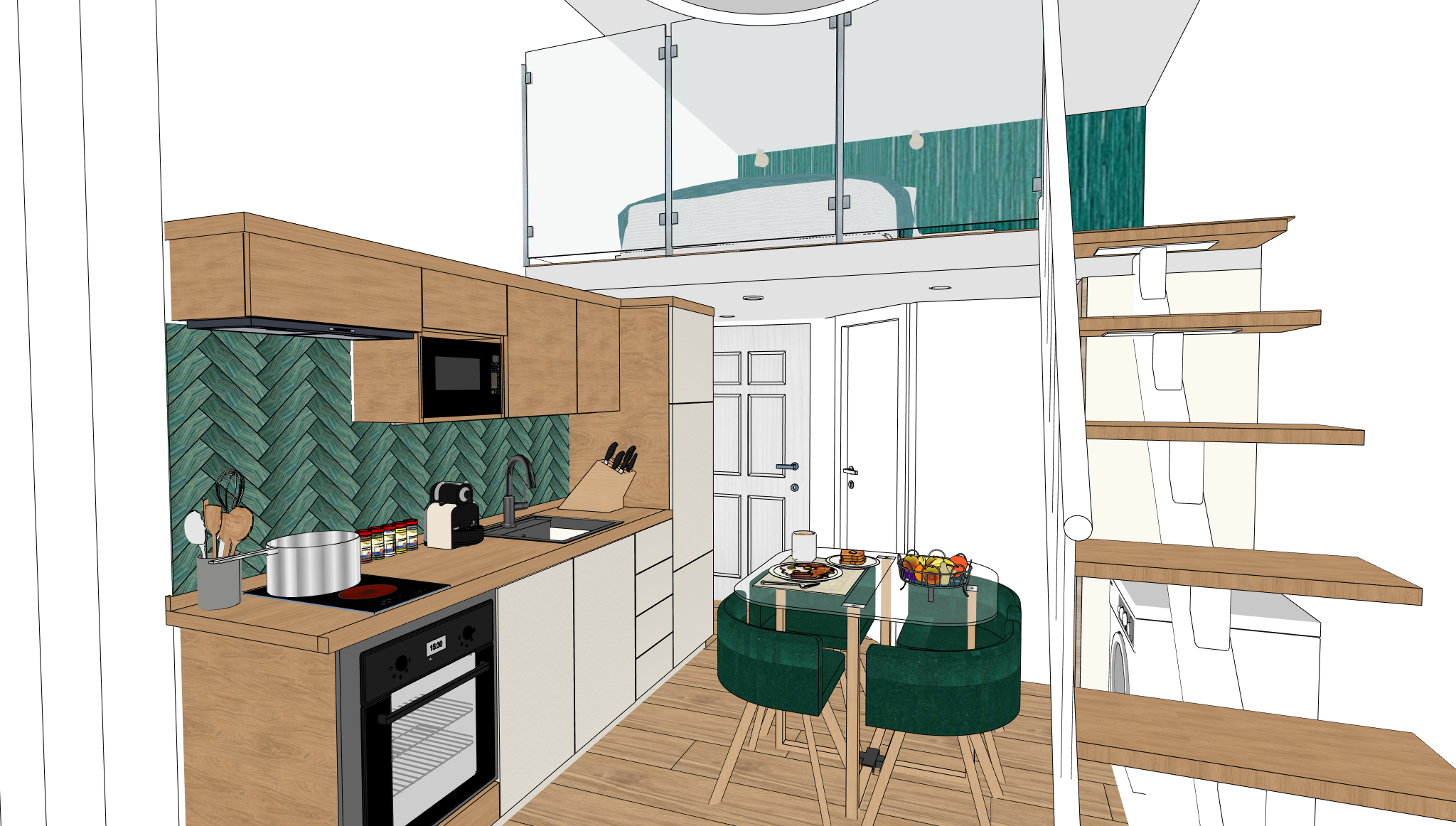 interior shot add soft sunlight and artilical light above the kitchen counter top adn the ceiling architecture