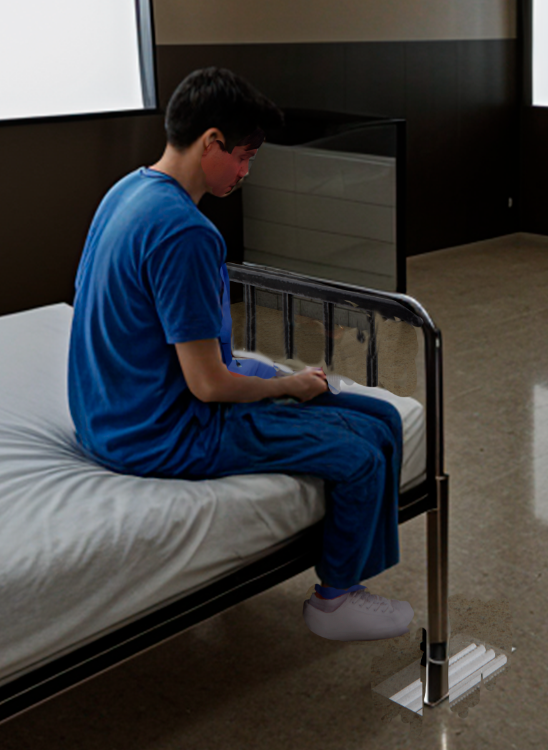 this person looks like an older man with gray hair wearing a blue prison inmate suit