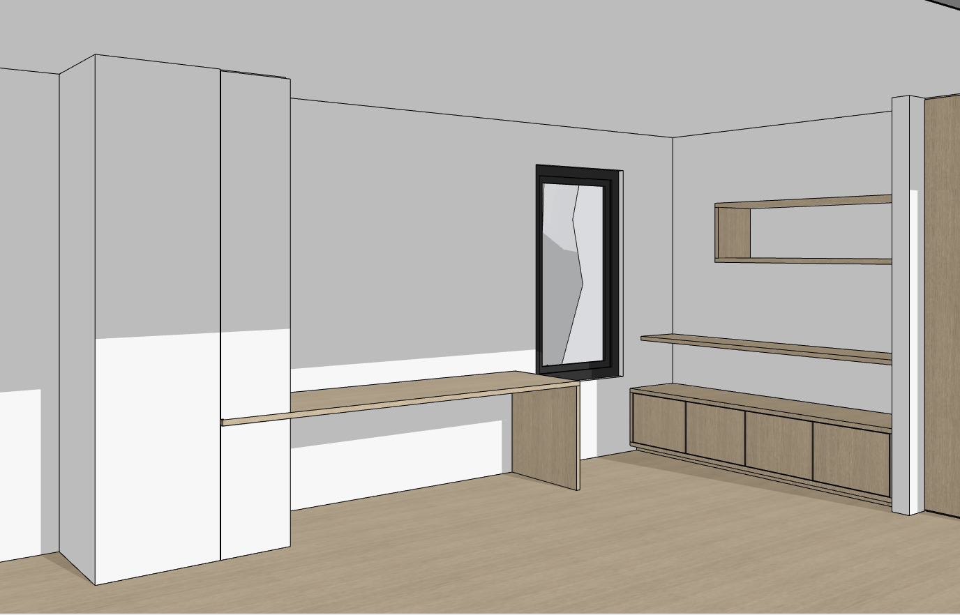 minimalist style add a chair to the desk add a sunset some decoration on the shelves