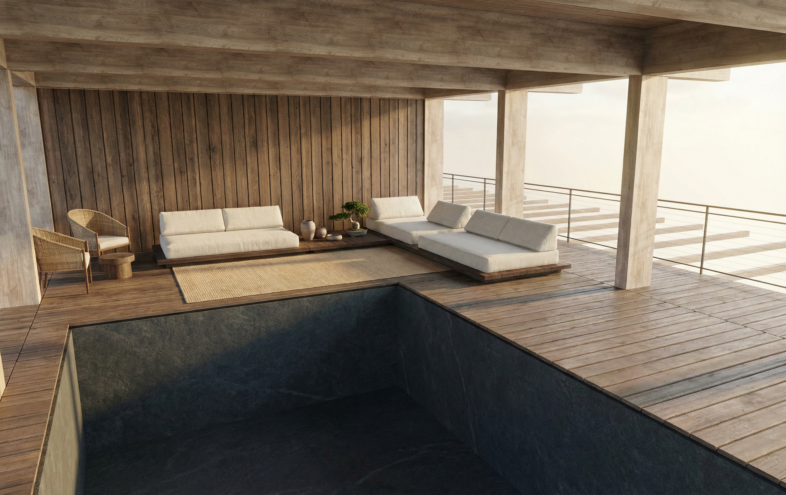 transform this image into a high end photorealistic architectural render add a little natural sunlight entering from the window on the left side creating soft shadows and realistic light bounce but keep the whole image light and without much contrast the curtains should be linen semi transparent the wall on the left is made of off white bricks the wall behind the counter is covered with textile like wallpaper the wall on the right side is also covered with a textile like wallpaper but in mint color there is a copper baseboard below the wooden floors should me matt finish light color light on the paper lamps hanging over the sofa with warm light enhance the fabric texture on the sofa the counter is white semi matt enhance material detail realistic reflections global illumination and natural color balance keep the original geometry and camera angle unchanged