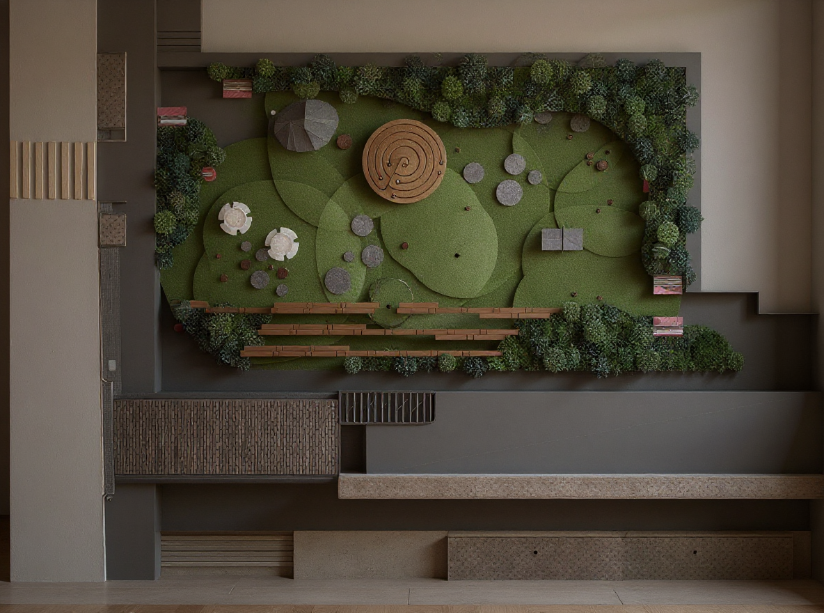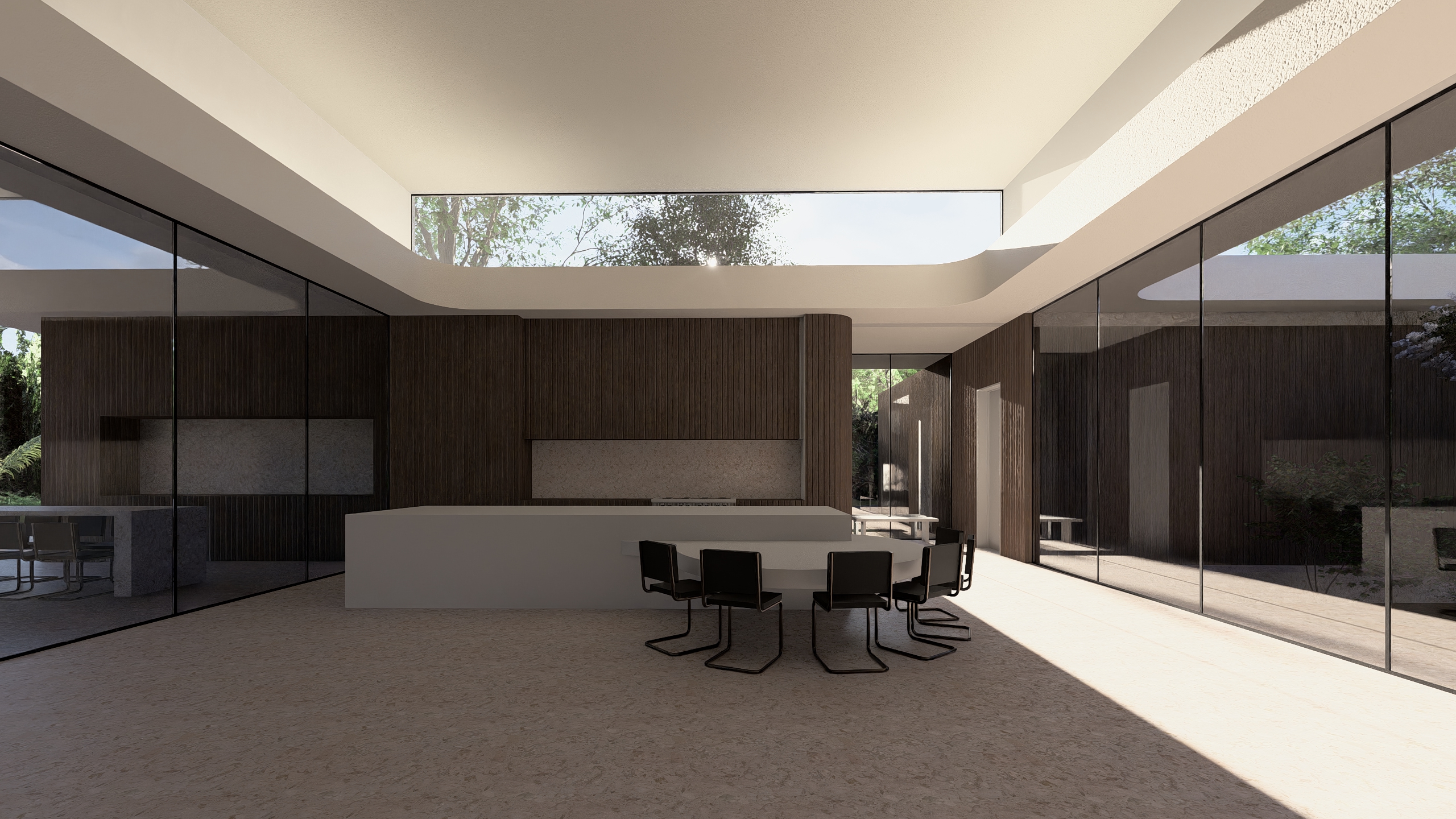 modern interior space with large glass windows allowing an abundance of natural light the walls are finished with dark wood paneling creating a rich sophisticated atmosphere the ceiling is a soft cream color contrasting the dark elements below a sleek contemporary table and chairs in black offer a minimalist design the floor is a warm beige tile adding an earthy tone outside lush green foliage can be seen through the windows adding freshness and tranquility to the setting the overall mood is serene with a perfect balance of nature and modernity