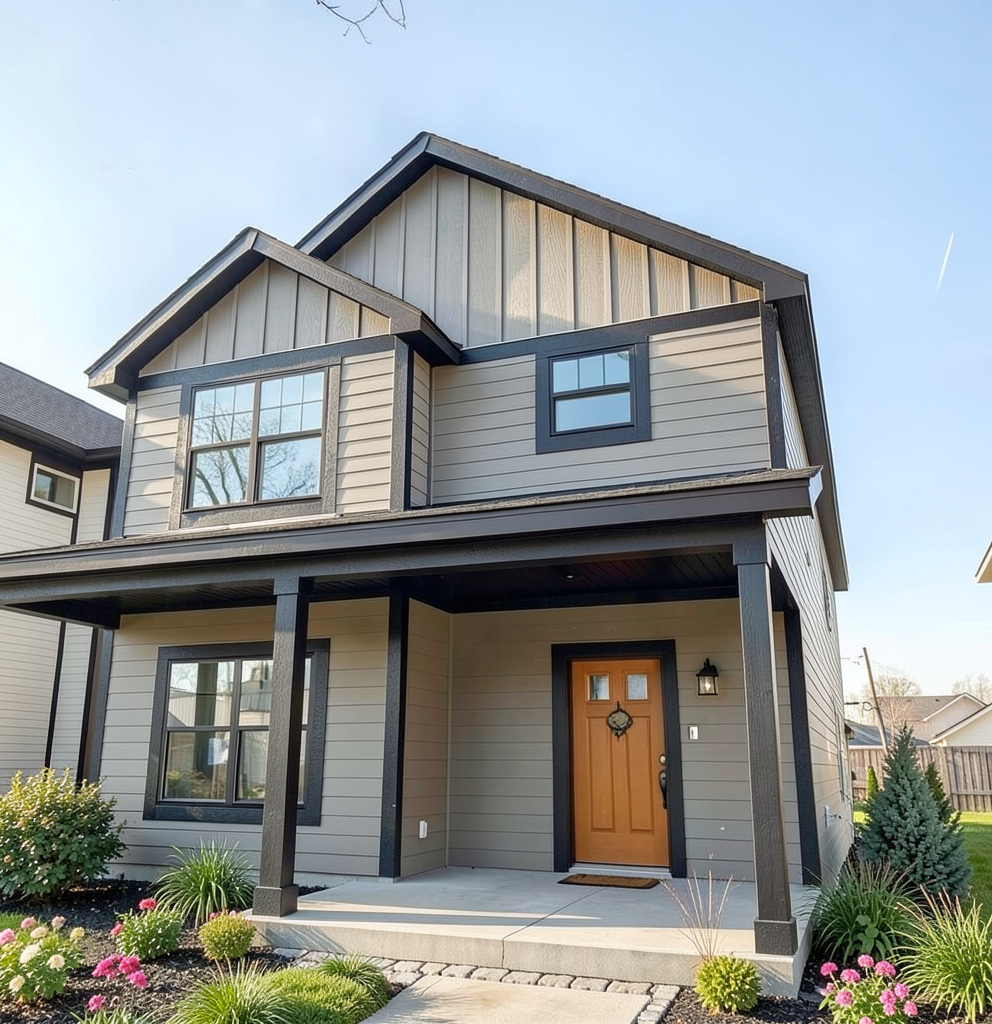 leave everything the same except make the front door a quarter lite door with no grids in the glass make the front doormat larger and layer it with a black and white striped mat underneth remove the decoration from front door make the door handleset a kwikset matte black