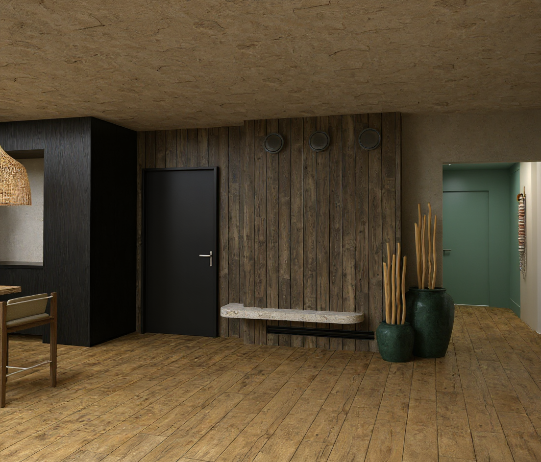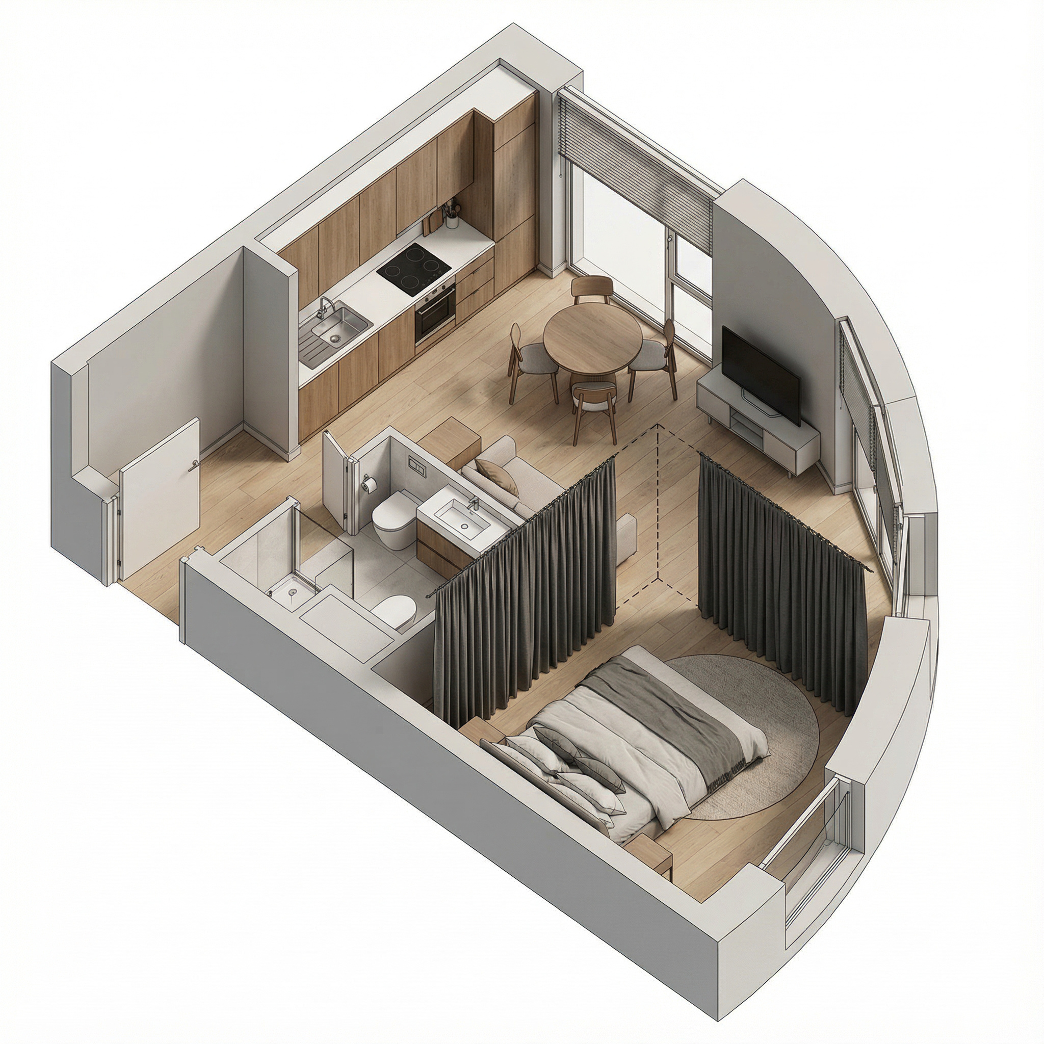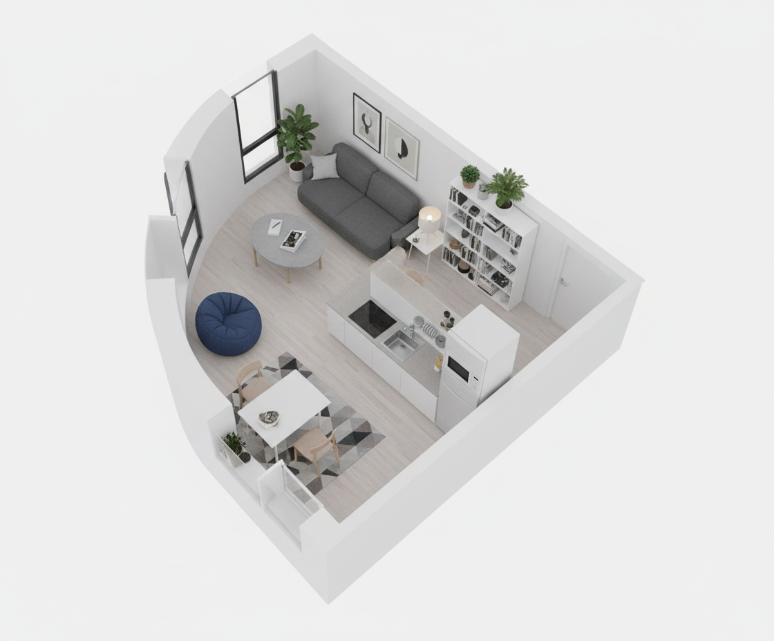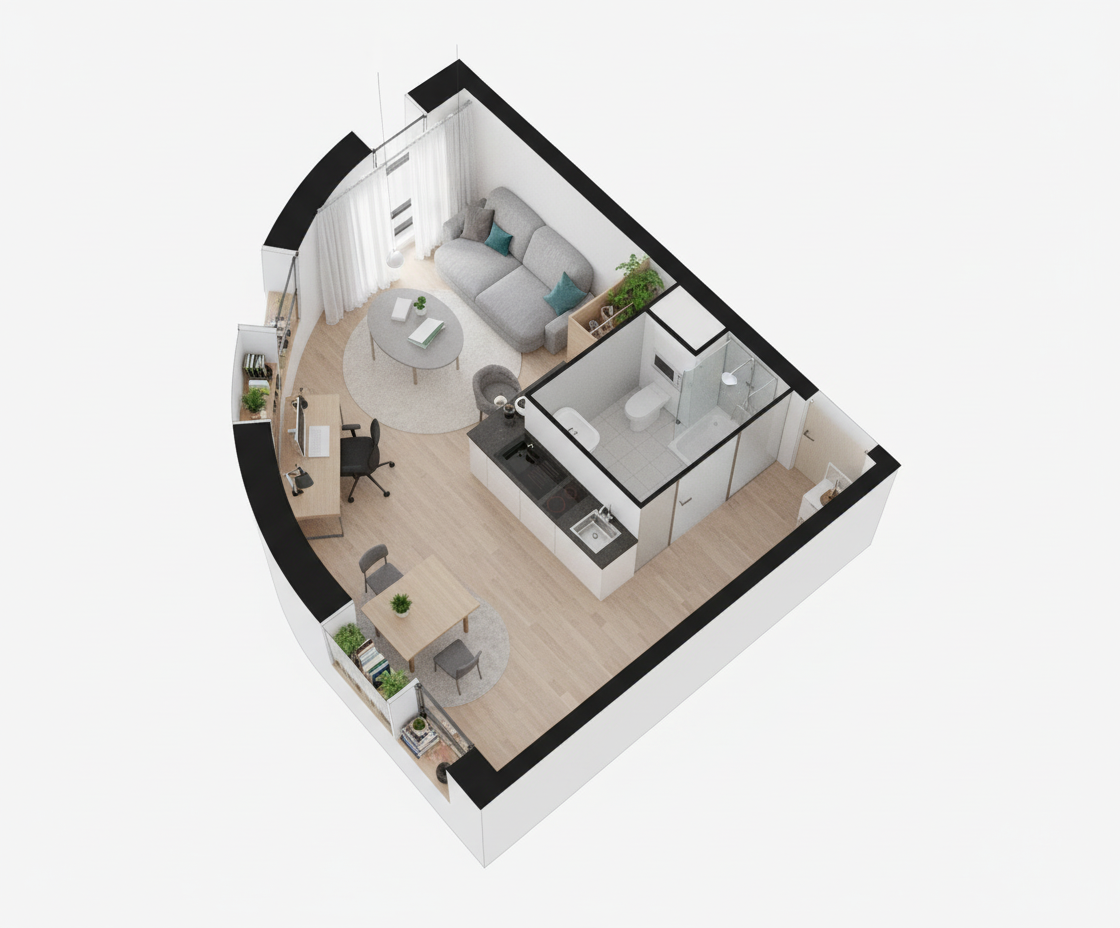 convert this floor plan into a realistic isometric 3d view of a office show the space from an elevated angle with furniture walls and details visible use the same furniture as shows on the plan do not change the orientation of the floorplan