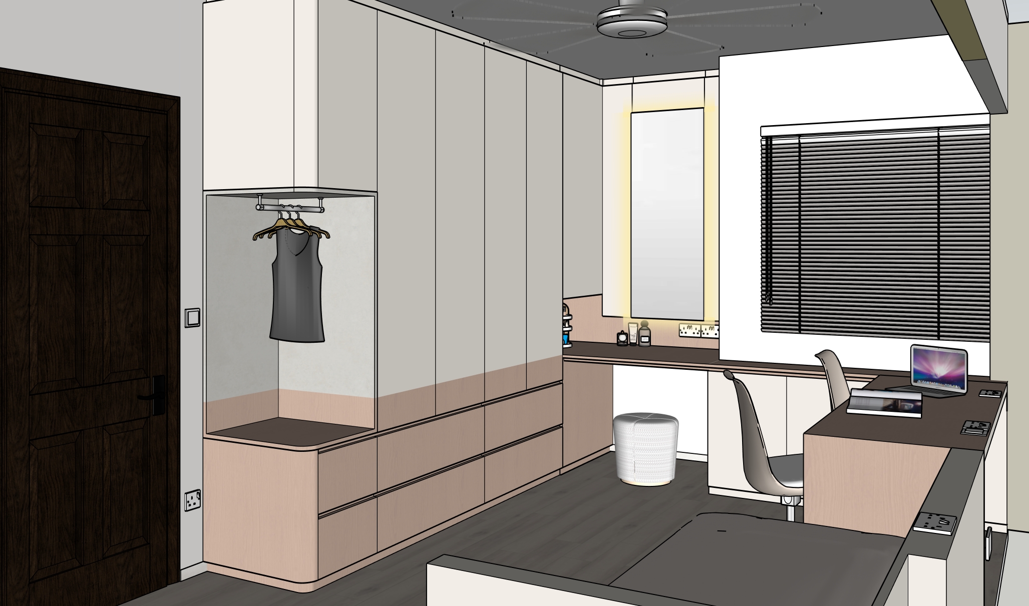 colours to remain accurate as per original given picture wood texture to be subtle dresser top hung middle in mirror wadrobe drawers and table top surface in muted soft pink subtle wood grains niche in light beige microcement and only bottom till study table in warm beige laminate with a soft blush pink undertone and subtle wood grain texture top half of carpentry in solid colour light beige and only bottom till study table in warm beige laminate with a soft blush pink undertone and subtle wood grain texture 2 casement door below window in solid colour light beige ceilng in off white floor in muted light beige vinyl subtle grains 50mm recessed top skirting on top of mirror cabinet ceiling fan in white