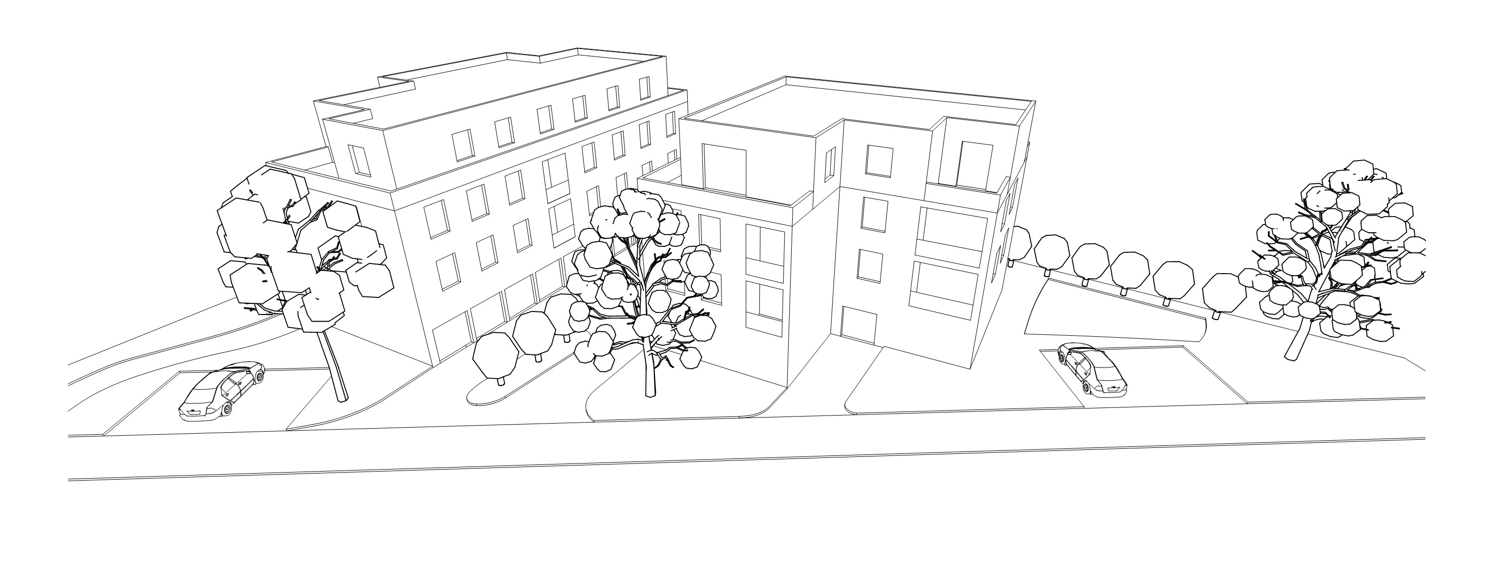 vorne stra e b rgersteig stellpl tze f r autos einfahrt zu garagen im erdgeschoss gr nfl chen dazwischen rechts neben geb ude spielplatz geb ude weisser anstrich fenster leicht begr ntes dach loggien als einschnitte dachterassen beim staffelgeschoss umgebung st dtisch