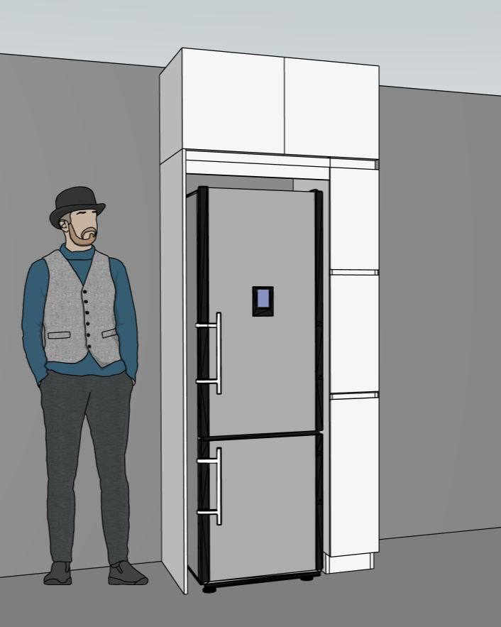 refrigerator niche with 3 drawers on the right side and a cabinet on the top no pullers contemporary design furniture gray wood finishing