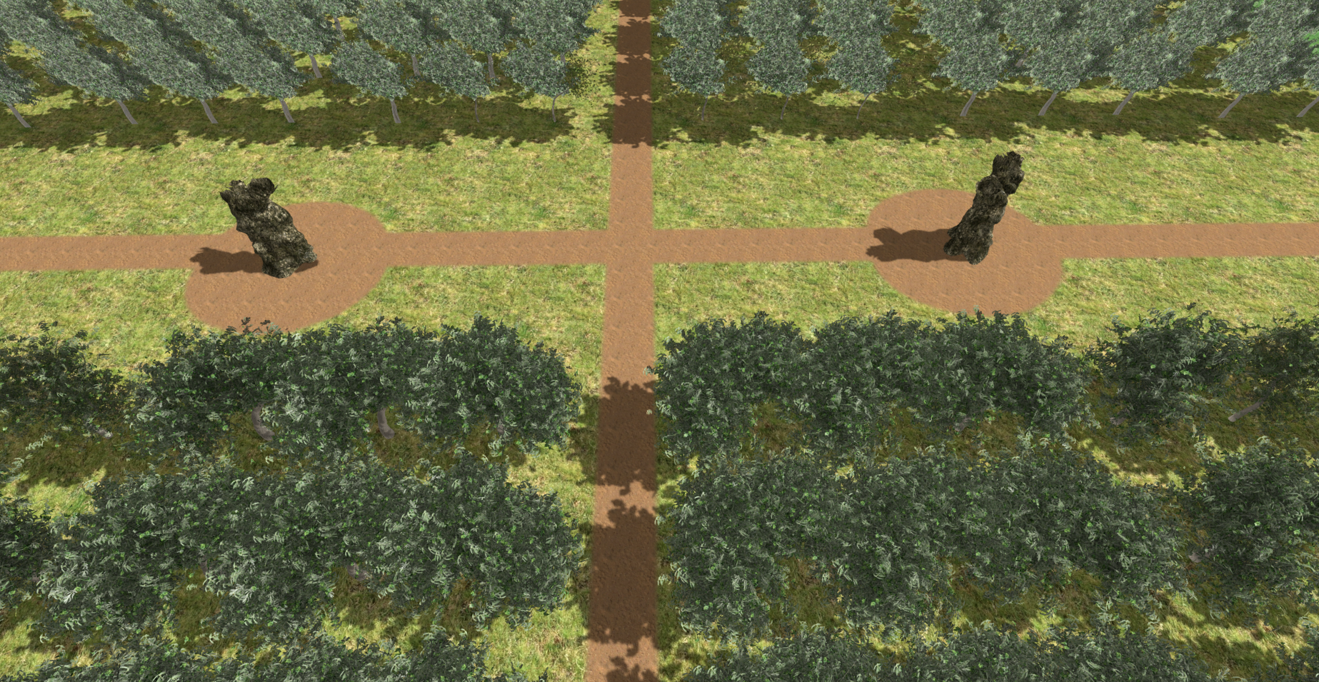 a realistic view from above of an olive grove with an orderly in line arrangement with two dirt roads crossing the olive grove in the center are two areas with 2 bare olive tree trunks with red earth around the land has wild grass where there are olive trees architecture