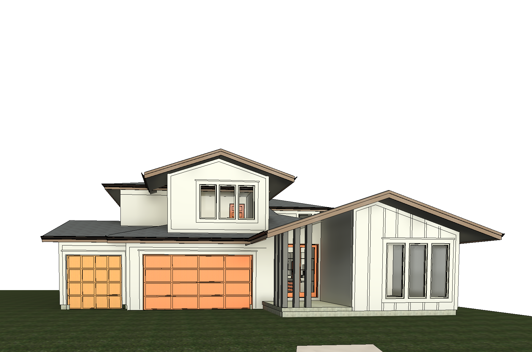 render this to look photorealistic with a natural treed background add floral landscaping make the walls a medium grey the trim a dark grey the garage doors and the front door make them a dark stain stucco look everywhere add small sized beam extension corbels at the roof peaks and make them the same color as the garage door windows to be black add a driveway off the garage and stoop and walkway to the front door and let me see a little of the street as well midday day lighting
