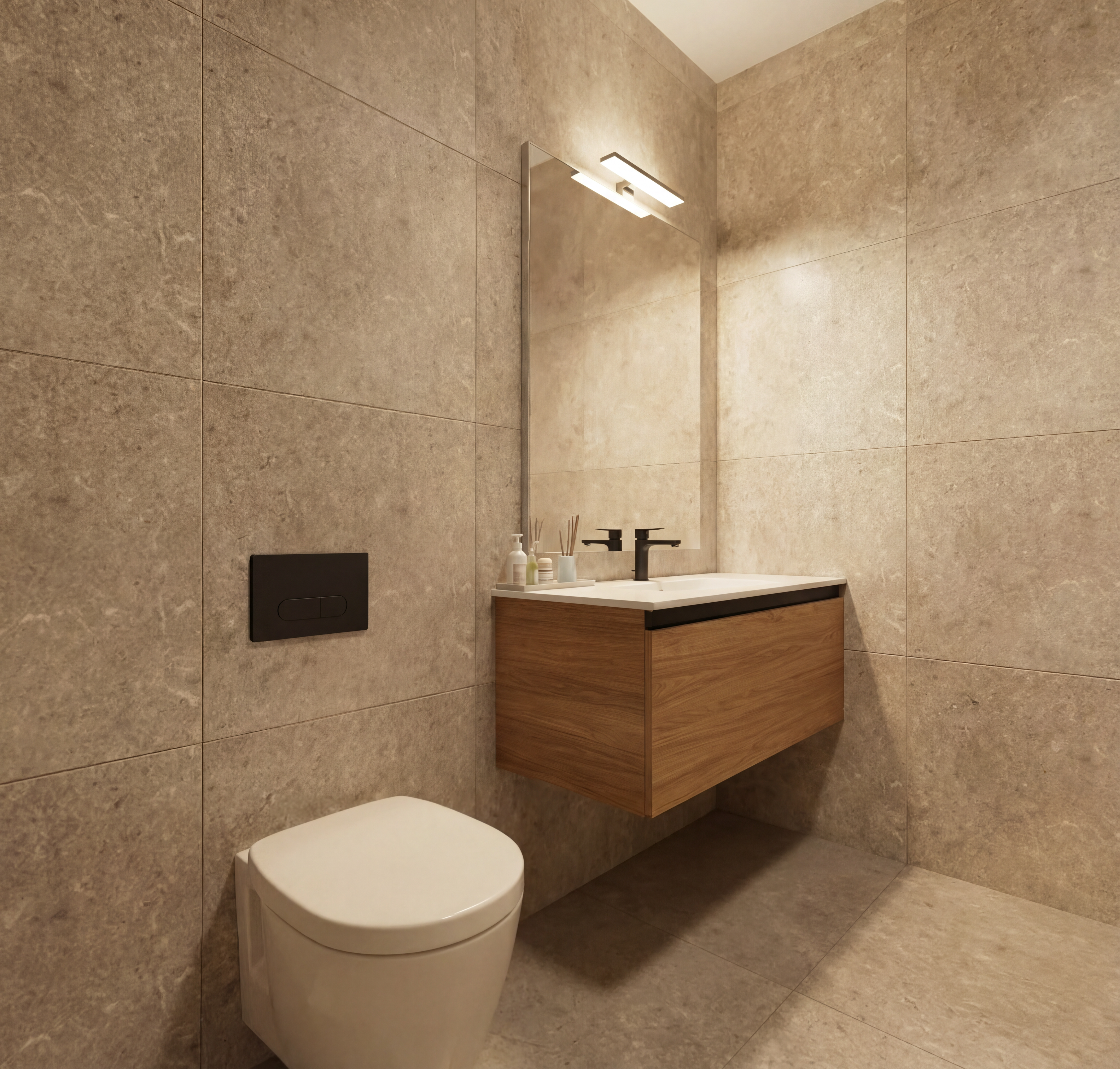 turn this into a photo realistic render and maintain materials have the downlights and pendant lights with a soft warm ambient light add realistic firewood logs under the electric fireplace and make the wine fridge under the island bench look real and have wine bottles in it