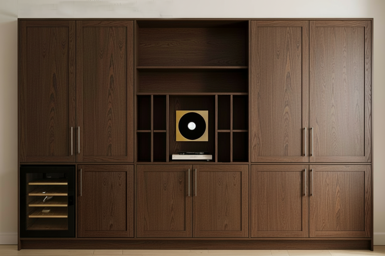 remove cupboard doors to show internals top left doors have a home bar inside in a light oak colour cupboard next to the wine fridge has a hidden drawer with large wine rack below all other cupboards have shelves
