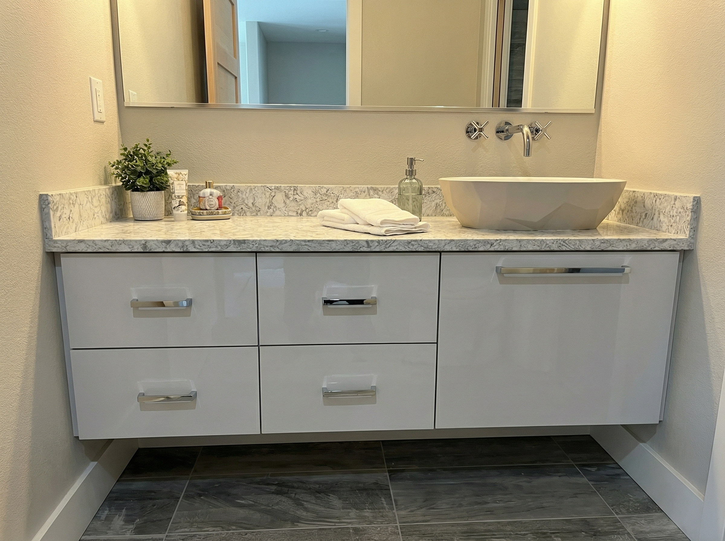 4pm evening a modern two story house with a sleek design and hip roofs featuring a dark neutral siding with darker trim medium to dark earthtone stone surrounds the entry and base the roof is a dark charcoal color adding contrast large windows dominate the facade reflecting the clear blue sky the front and garage doors are very dark stained wood surrounding the house a lush green lawn with colorful flower beds in shades of pink lavender and yellow lansdcape stones dot the yard framing plantings the atmosphere is serene and welcoming with evening sunlight casting gentle shadows do not modify the massing as shown