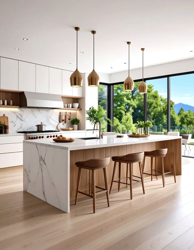 keeping the layout of this kitchen as it is please change the cabinets on the back wall only to a mid grey not too dark leave the island shape as it is but change the colour of vein in the top and side to gold with a hint of blush pink put sage coloured blinds at the windows make the light pendants more rounded change the flooring to a light coloured grey in herringbone style change the colour of the bar stools to a faux colour