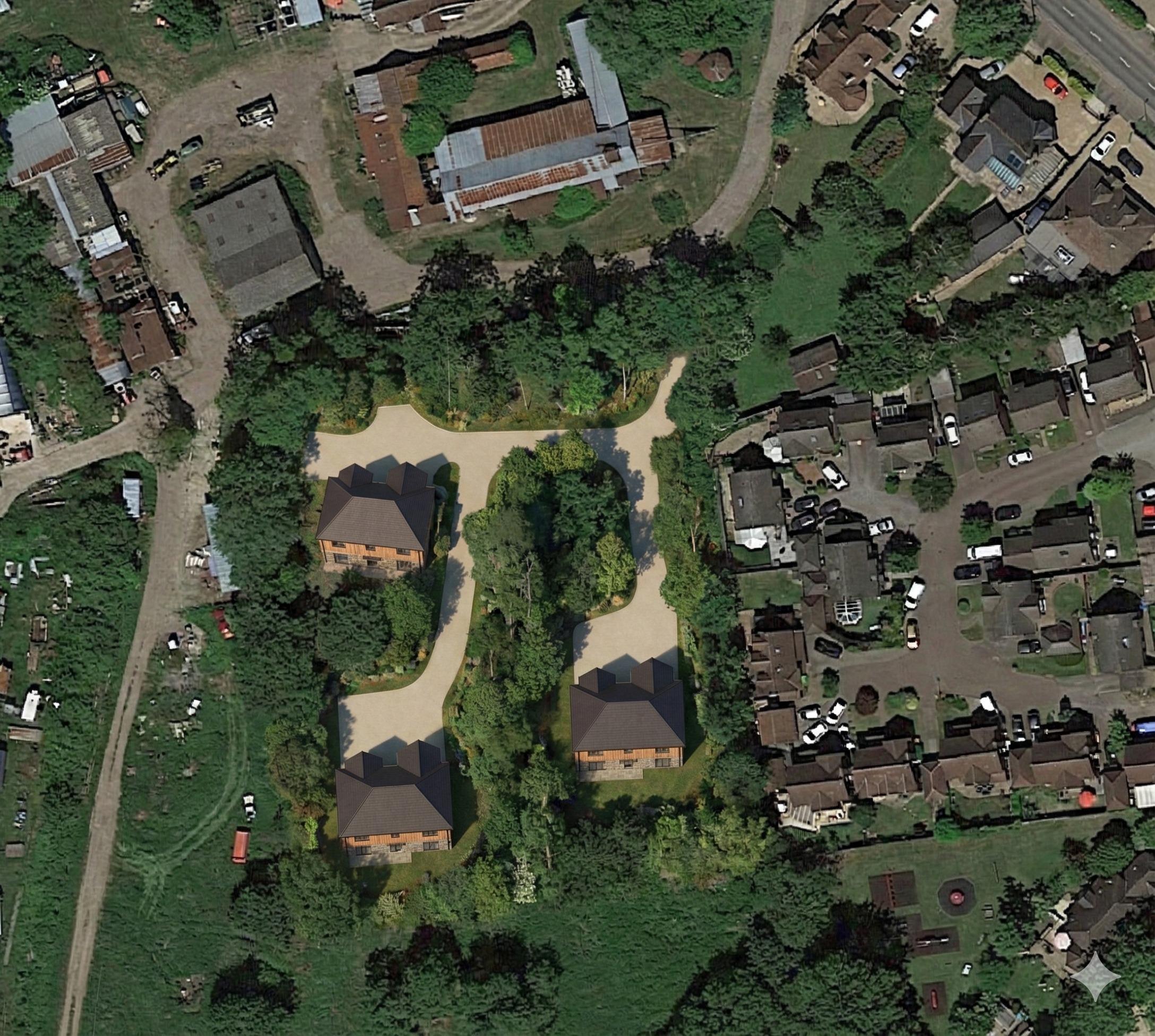 show a 3d visual of the 3 proposed houses within the woodland make sure the houses fit harmoniously within the woodland and trees