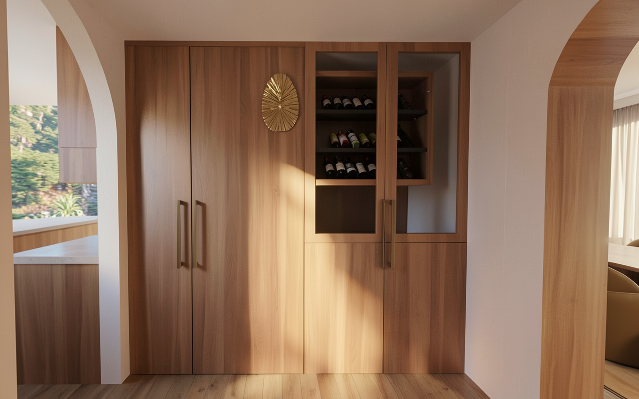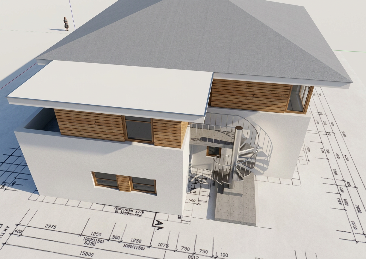 do not change the materials of the building and do not change the design of the building enhance the stone material and enhance the charcoal grey corrugated metal panels do not change the parking and road do not change the curb design this is a commercial building do not change the charcoal grey color of the building add a light sky do not show grass on the road show some trees in the background