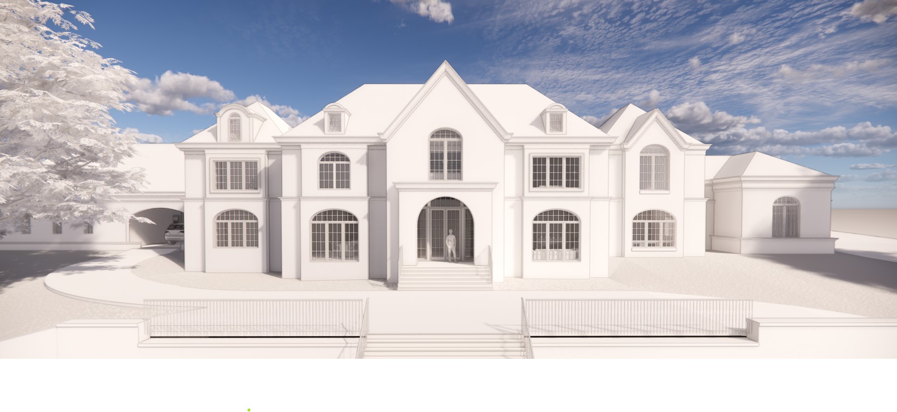 white stone walls dark slate roof charcoal gray steel windows and trim arched opening at entry vestibule and front door arched front door and sidelights add more gable roofs add lush landscaping bushes and flowers in front of house add oak trees behind house