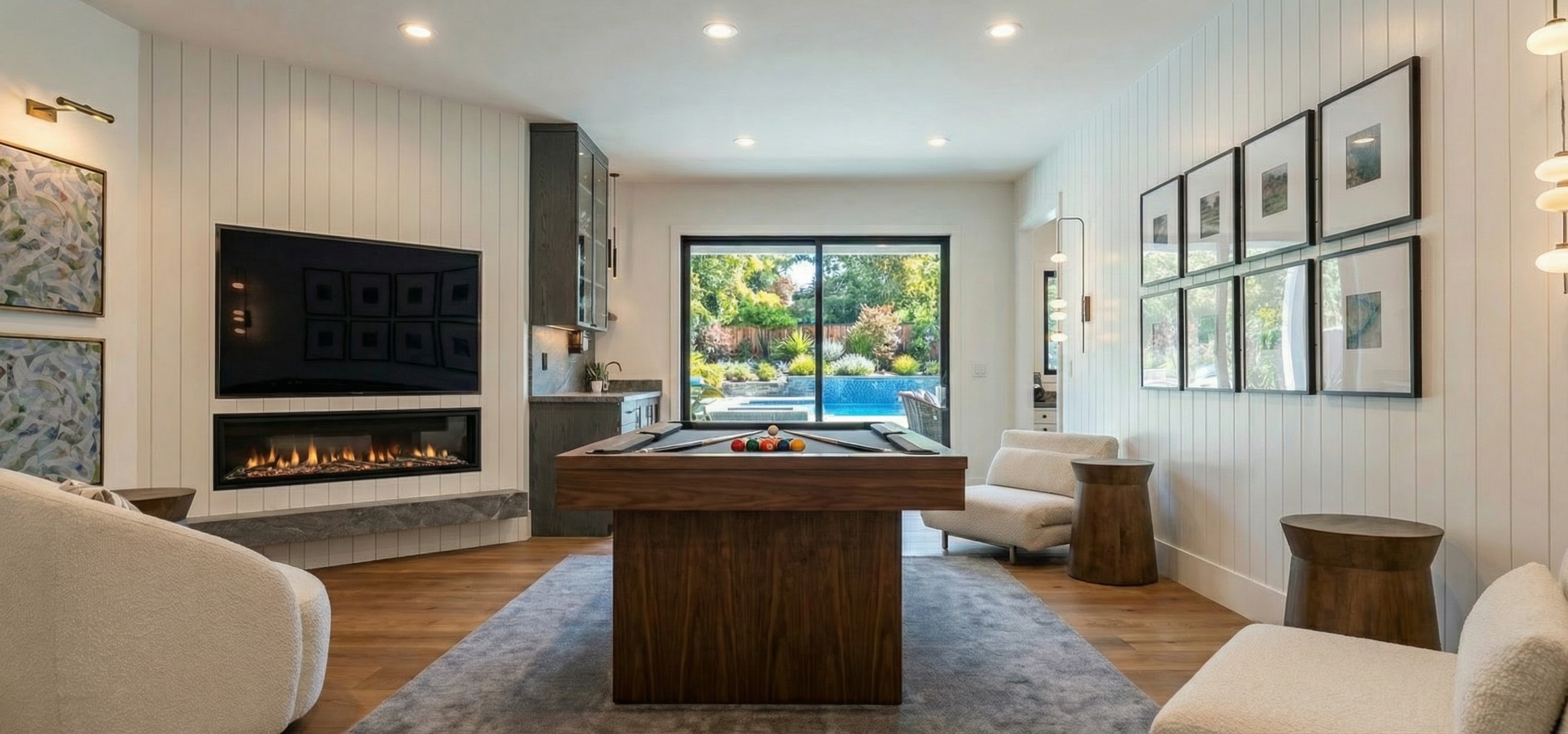 create a photorealistic rendering of this downstairs living area keep all details the same but change wood floors to light oak an change rug to jute natural texured rug