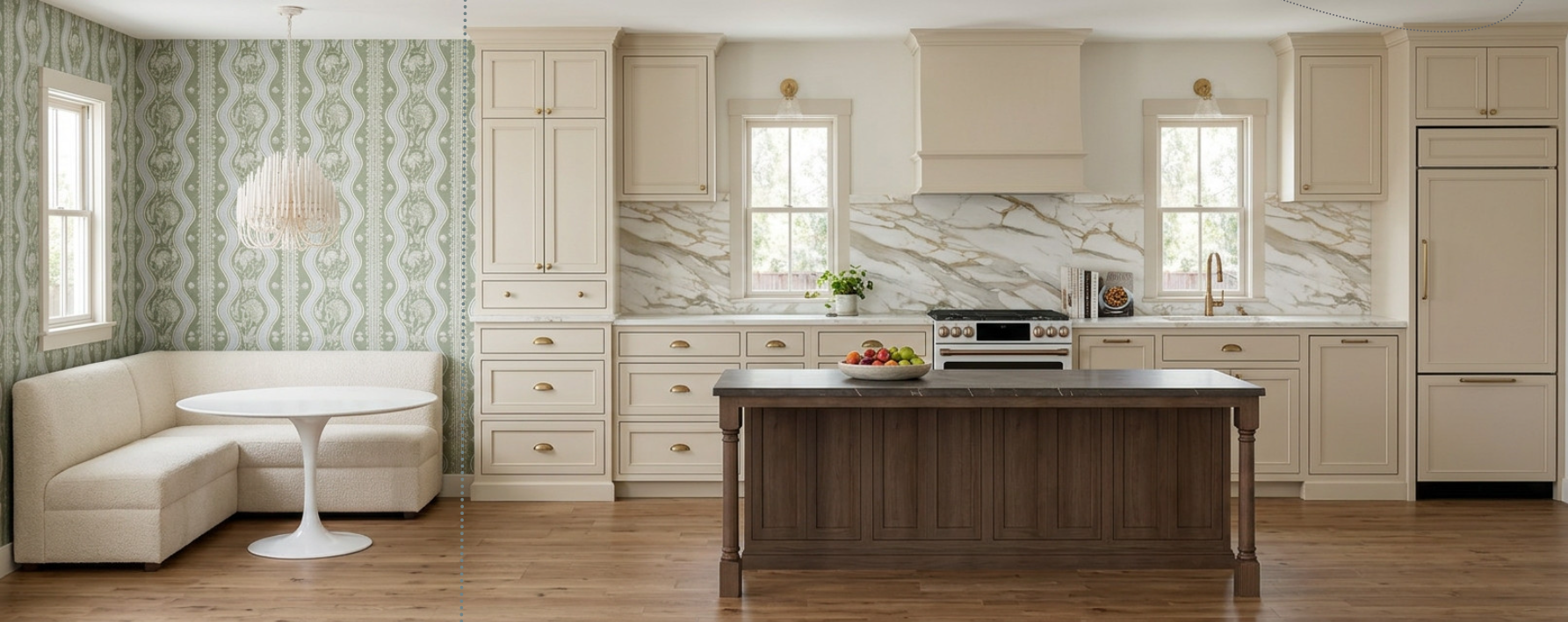 add a window behind banquette on wallpaper wall and add curved open shelving to the space between booth seats and cabinets