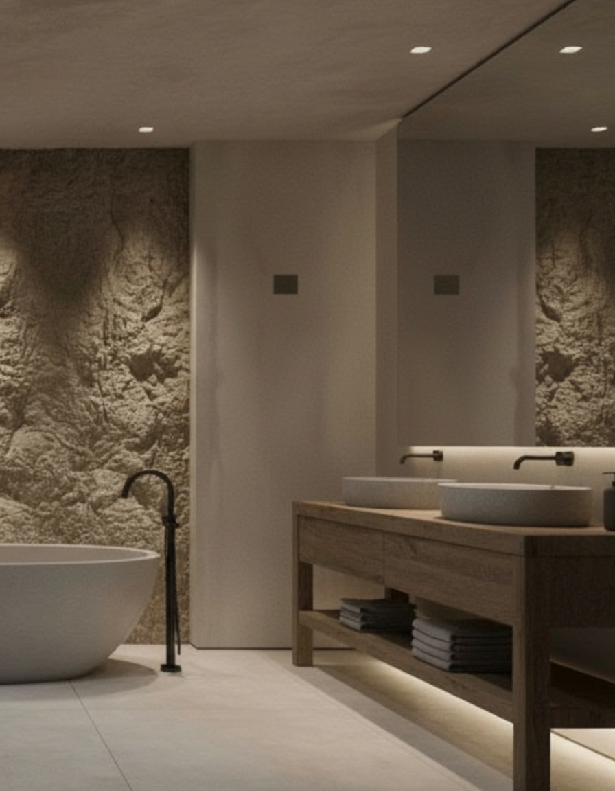 interior render with soft textures set in a dreamy misty bright forest and smooth ground in the background render in watercolor style have a peak of a bedroom through one of the open doors and add people conversing