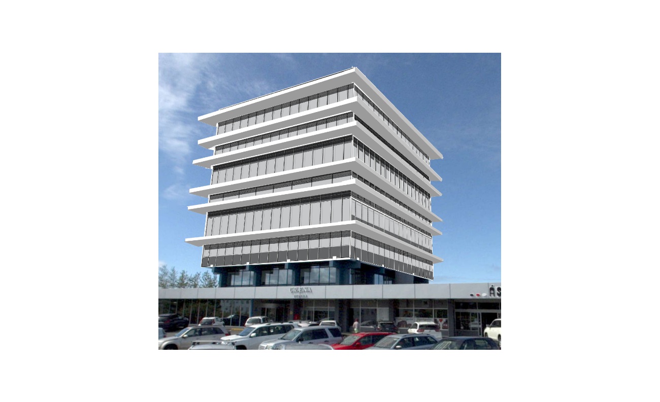 the image shows a 6 story office tower on a retracted base the office tower is clad with curtain wall window system with deep relief creating horizontal profiles extruding from the facade almost floating the window mullions are white and the dark gray panels is actually milk white glass with the light gray vertical paneling in the image representing where the windows are the windows reflect the sky around with each floors windows tilted slightly to reflect different portion of the sky the whole facade has an overall airy transient feel with white mullion and paneling and the reflected sky giving the facade a ligth frame like feeling light is eminating from some of the office windows use the last image but render it in the evening with the sun setting with lights glowing from the building show office furniture and people inside the horizontal extruding bands are white metallic reflecting the sunlight on the edge while creating a dramatic shadow onto the windows