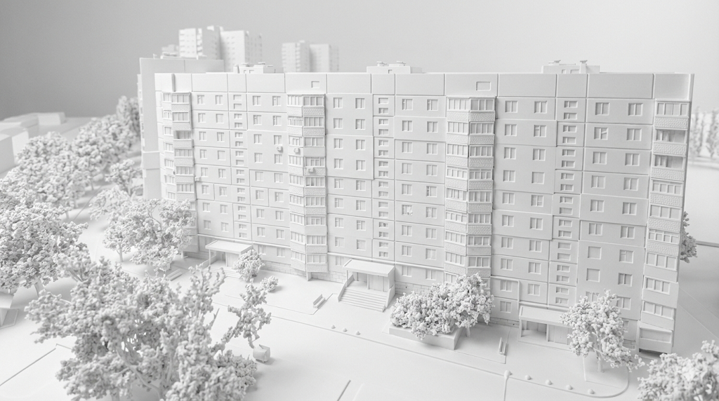 a vibrant modern urban scene featuring a high rise apartment building the building is painted in shades of light grey and white with accents of blue the lush trees surrounding the structure are in varying shades of green providing a refreshing contrast the sky is a bright azure with wispy white clouds creating a serene and peaceful atmosphere the sun casts warm golden rays creating subtle shadows on the building and ground highlighting the architectural details the overall mood is calm and inviting