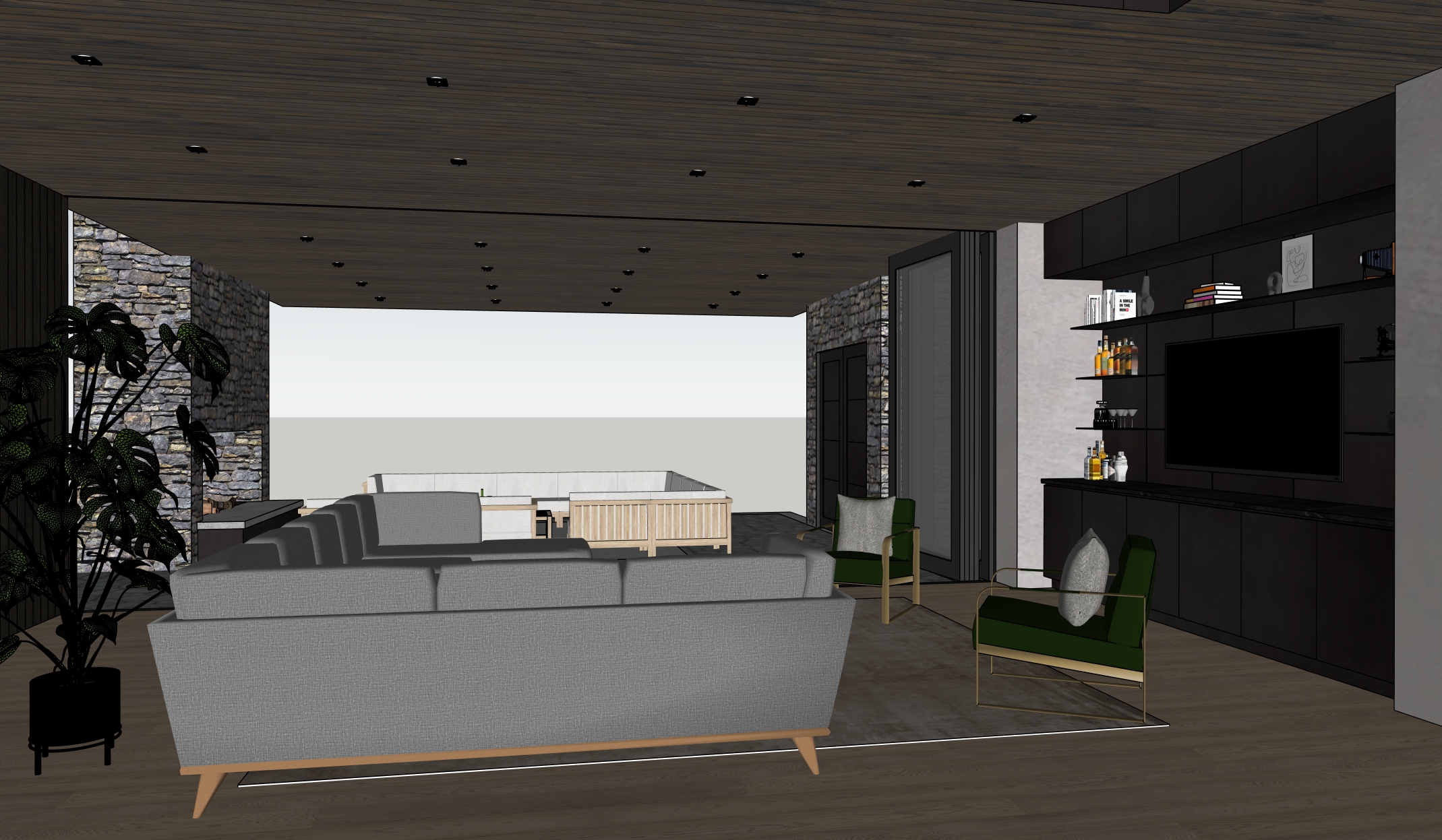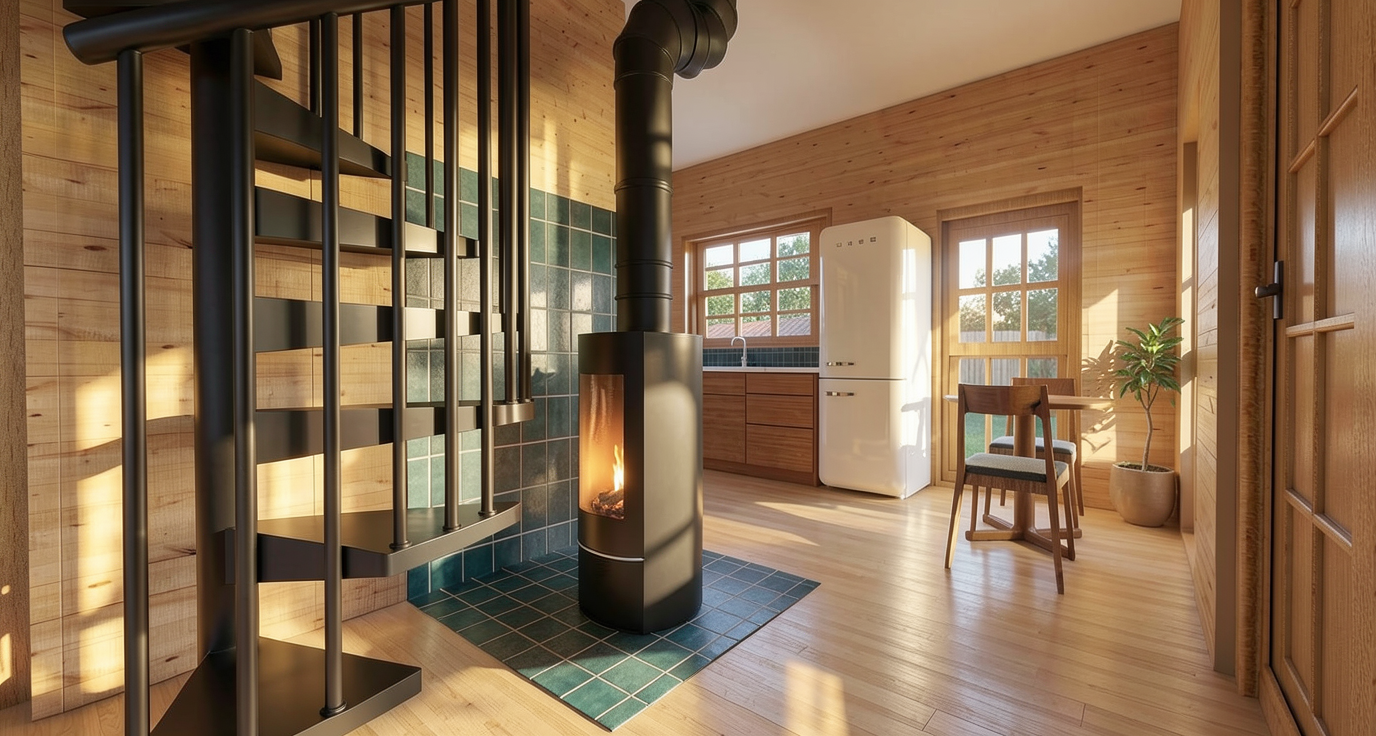 home located in the blue ridge mountains near asheville north carolina rough hewn tennessee fieldstone and stained vertical shiplap siding dark metal accents and window frames plate steel chimney coping to match window frame color concrete paver driveway home located in north carolina hardwood forest with dense trees beside home no trees behind house grasses and sparse native plants in foreground no lawn morning light with light fog in trees behind