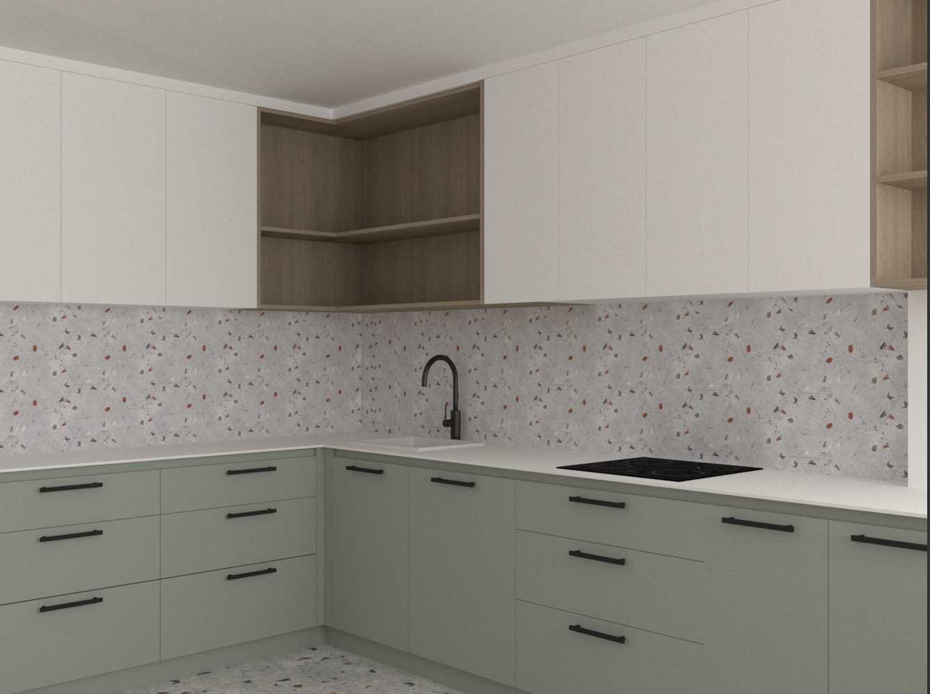 add natural light window is behind camera on the left add simple modern kitchen appliances and decoration