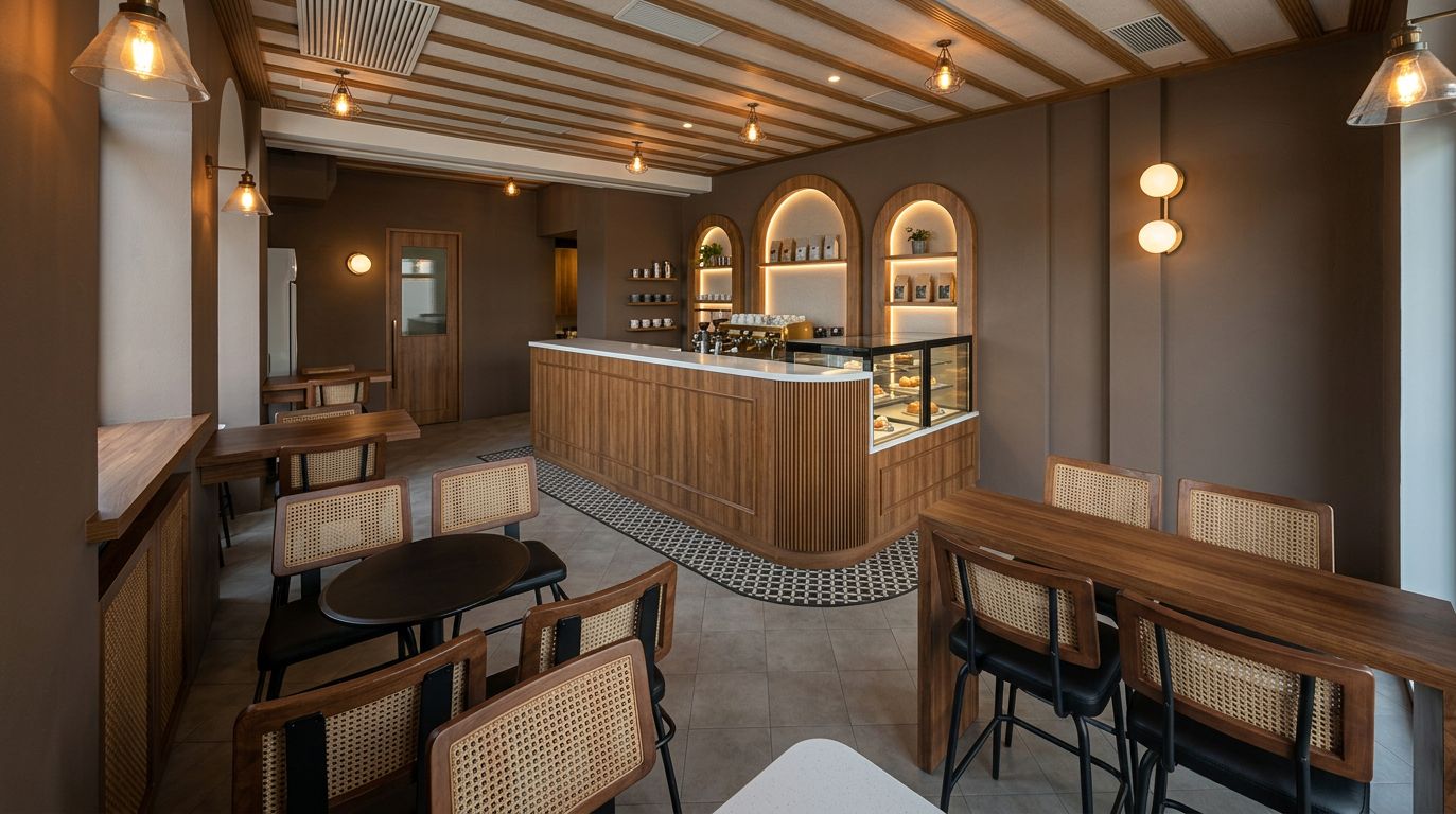 paint the ceiling white without the brown wood and keep the size of the tiles but change the color from brown to terracotta color