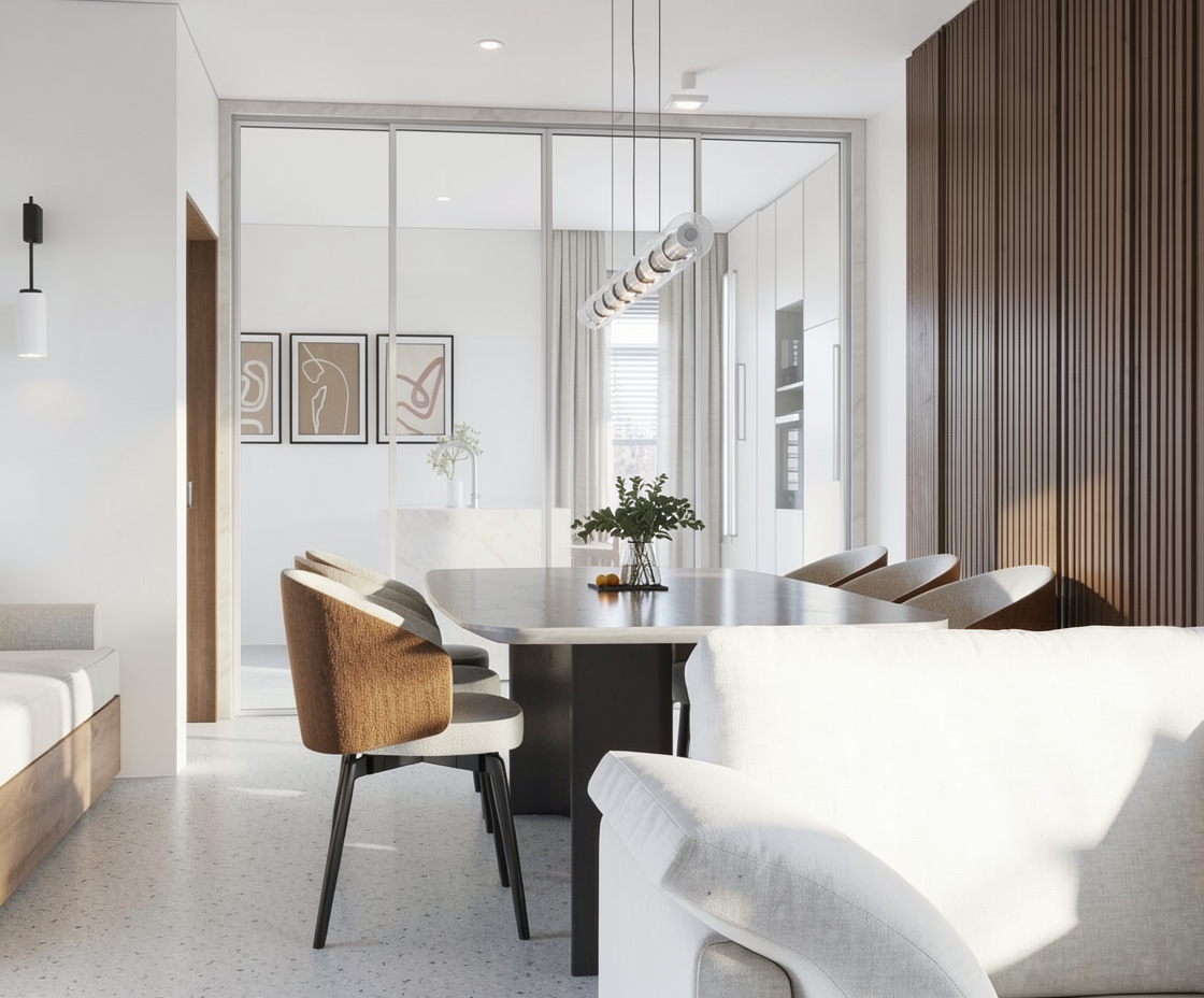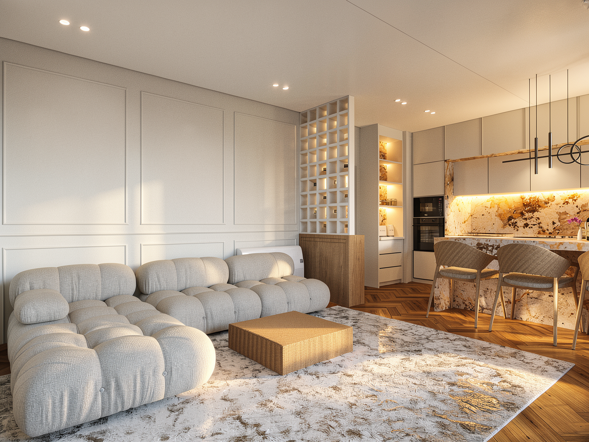 ultrarealistic render led at the kitchen white carpet
