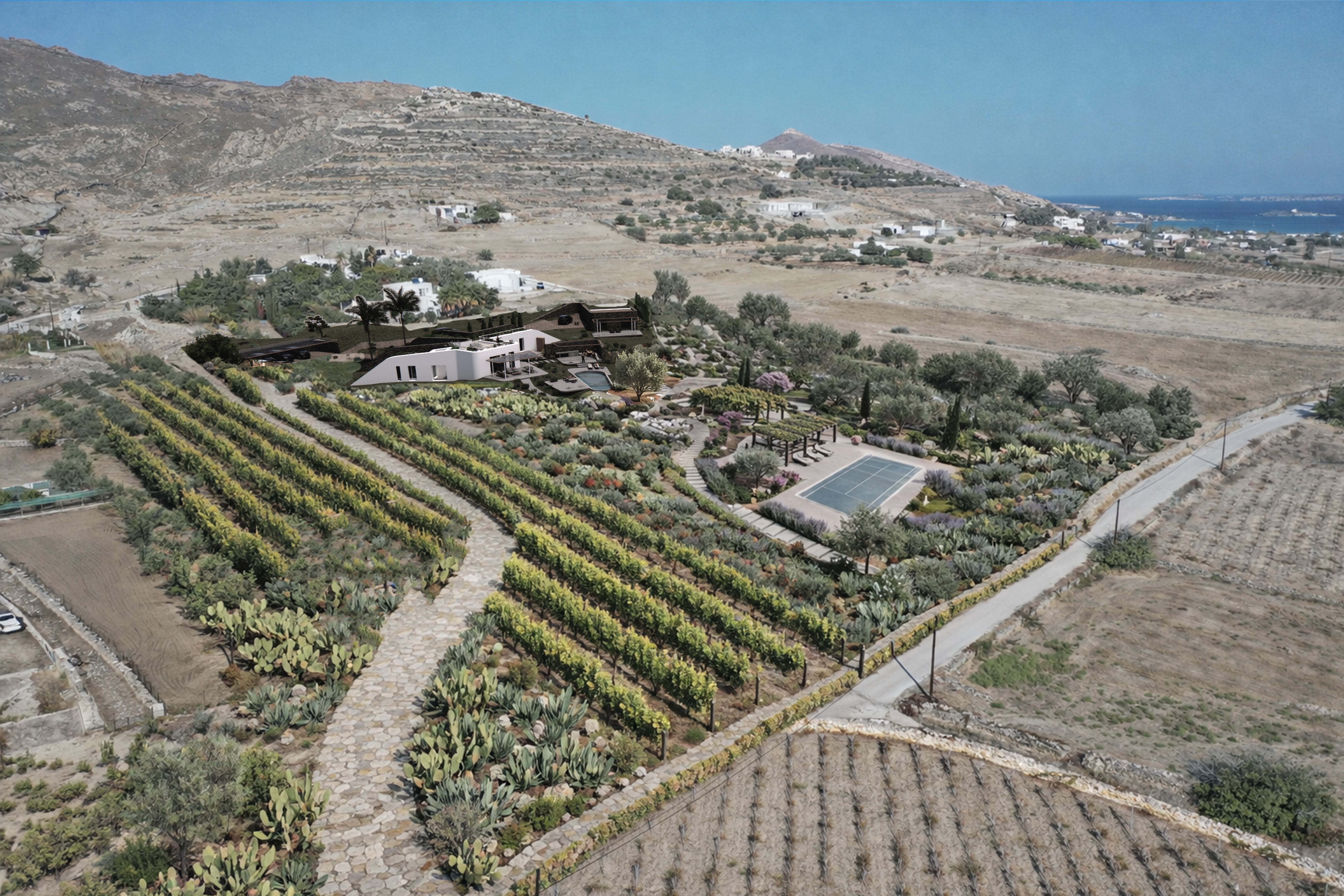 a picturesque mediterranean landscape featuring terraced hills and lush vineyards leading to a modern villa surrounded by vibrant gardens the atmosphere is serene and idyllic capturing the warm glow of the midday sun the hills are in warm earth tones with shades of beige and light brown while the vineyard rows are rich in dark green and golden hues the villa is a sleek modern structure in white and light gray harmoniously blending with its surroundings the gardens are abundant with colorful plants showing bursts of purple pink and green the sky is a clear azure blue enhancing the peaceful ambiance