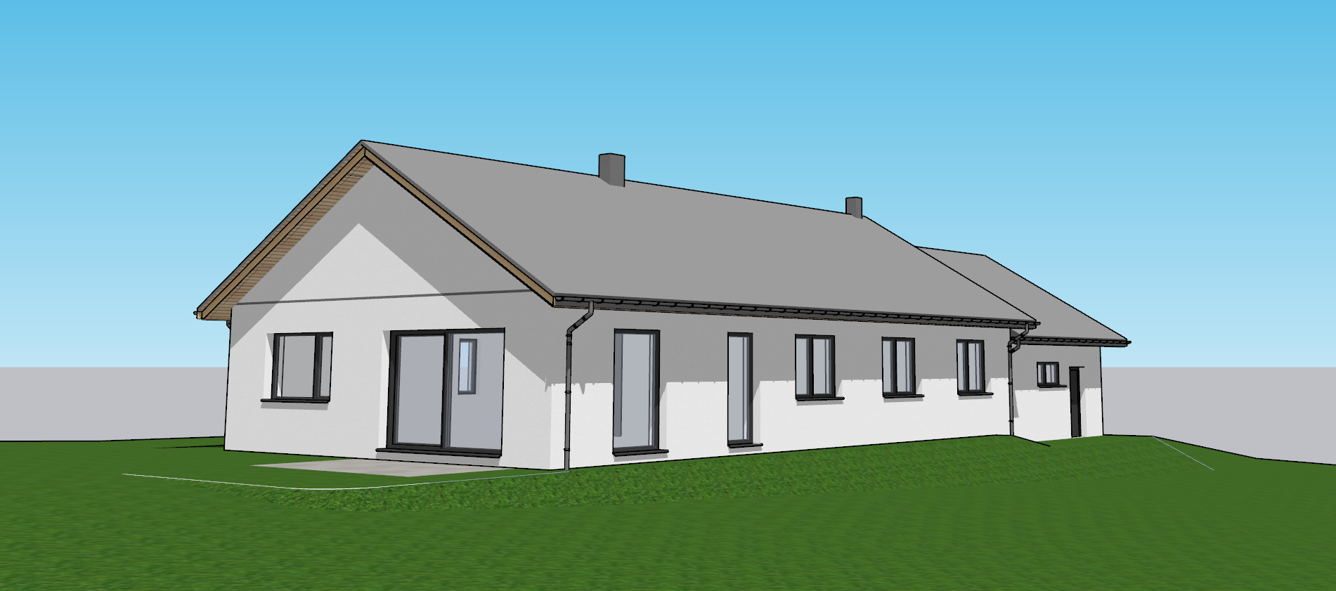 a roof made of flat gray tiles laid in a staggered pattern white plaster on the walls a gray strip on the gable wall anthracite colored window and door joinery a chimney covered with gray seam sheet metal low bushes around the house sunny sky lamps in the soffit curtains in the windows children playing a terrace made of paving stones a garden sofa and a barbecue on the terrace