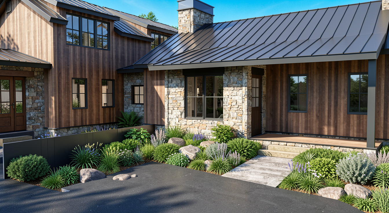 light stone with darker siding black windows black trim black garage doors black front door black roof