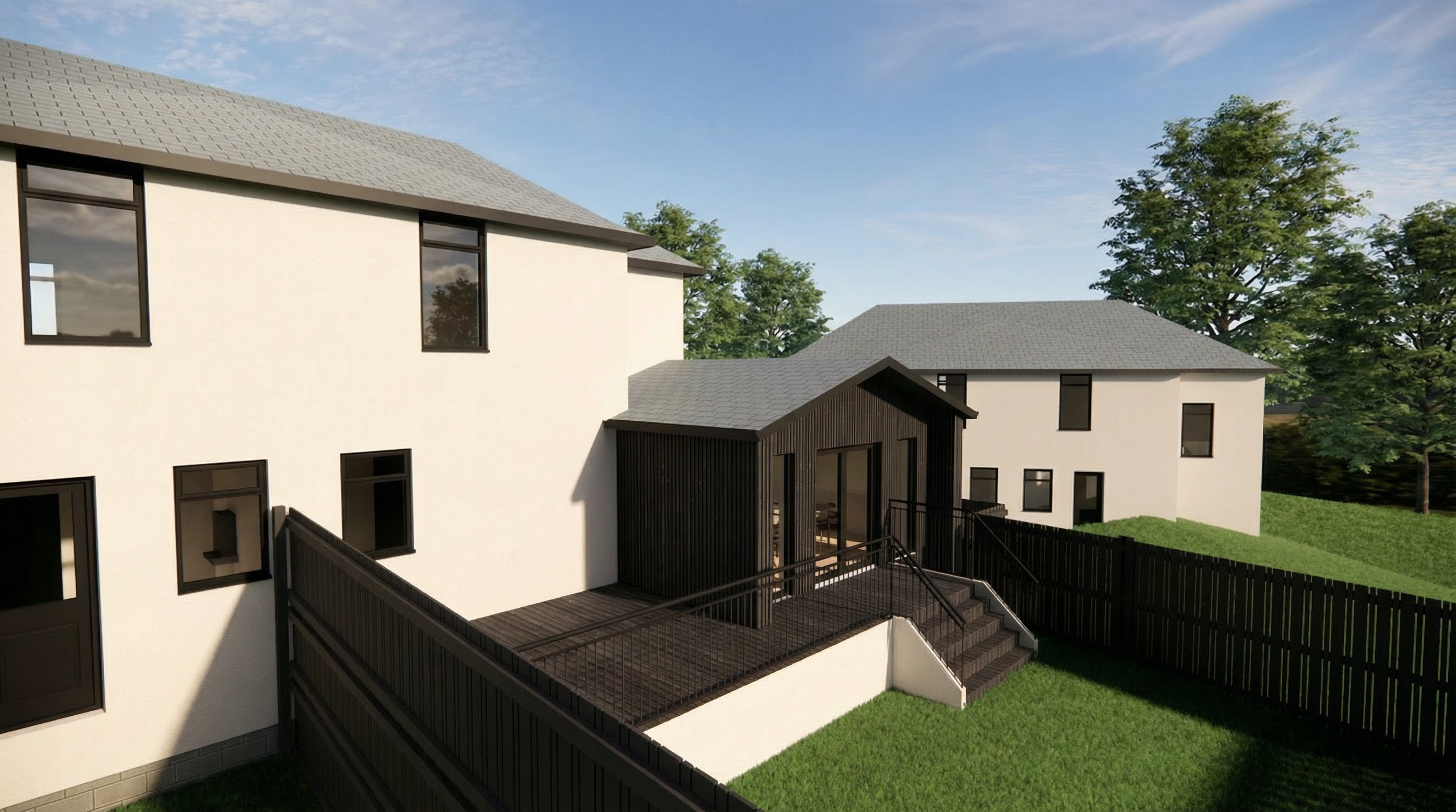 keep the exact same geometry scene content object positions materials textures and camera framing as the original render apply only atmosphere lighting mood and color grading set the scene at midday sky with thin soft clouds and a cool to warm gradient steel blue overhead transitioning to warm tones near the horizon use cinematic soft lighting with moderate contrast gentle shadows cool ambient fill and warm interior window glow inviting realistic color grade cool shadows cool midtones warm highlights teal in shadows and midtones warm highlights controlled saturation clean neutrals no oversaturation photorealistic architectural marketing render look balanced exposure slightly cool white balance remove the fog make it brighter and softer keep the original bike lane remove the people keep the original text on the building remove the car desaturate it by 30