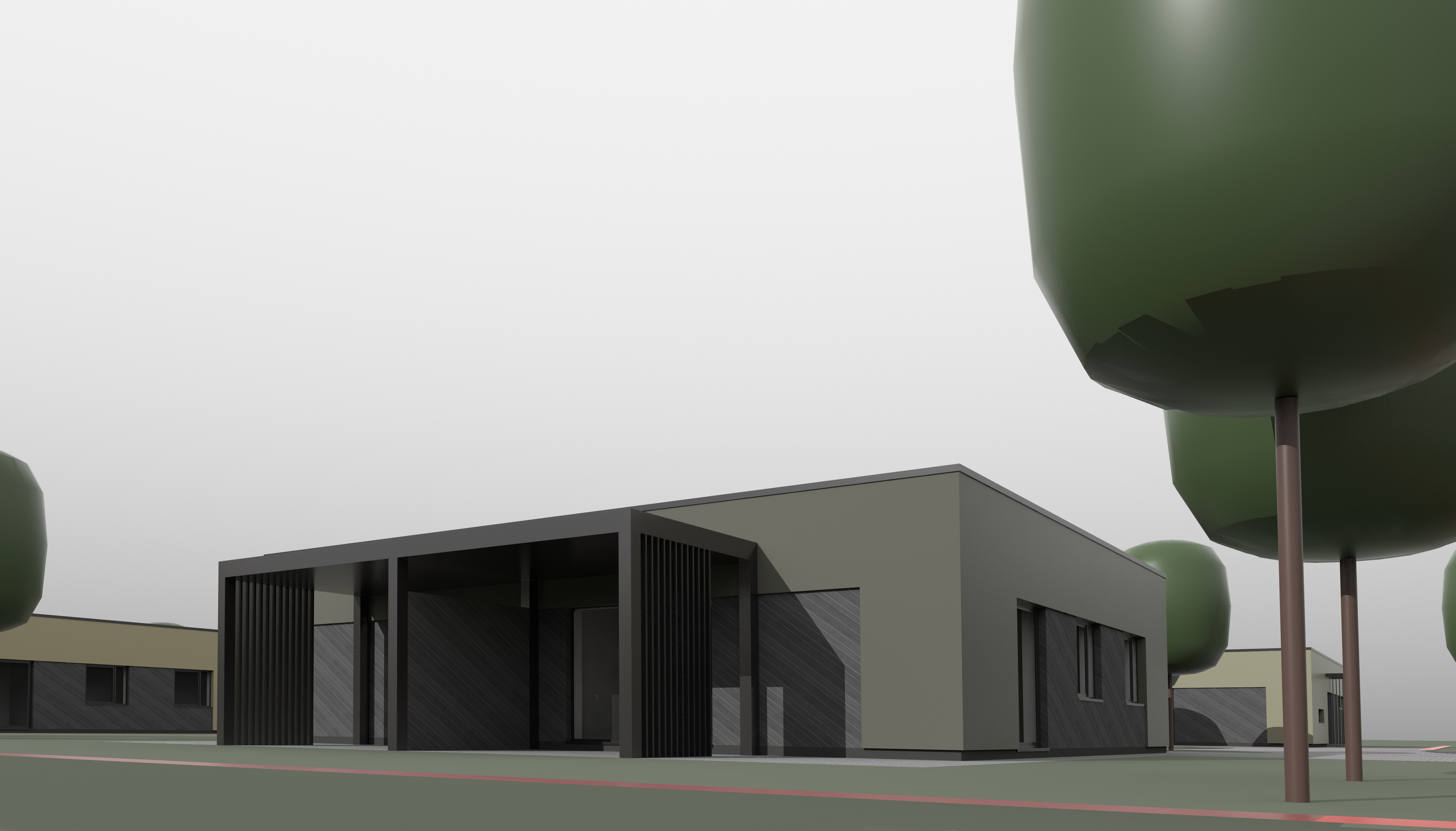 minimalist modern architecture single story building with clean lines and large windows soft olive green and yellow green facades matte dark grey accents 45 degrees grey wood planks scots pine trees with deep green foliage and brown trunks cloudy day sky creating a calm and serene atmosphere soft diffused lighting enhancing the minimalist aesthetic change red lines to dark grey metal wire fence
