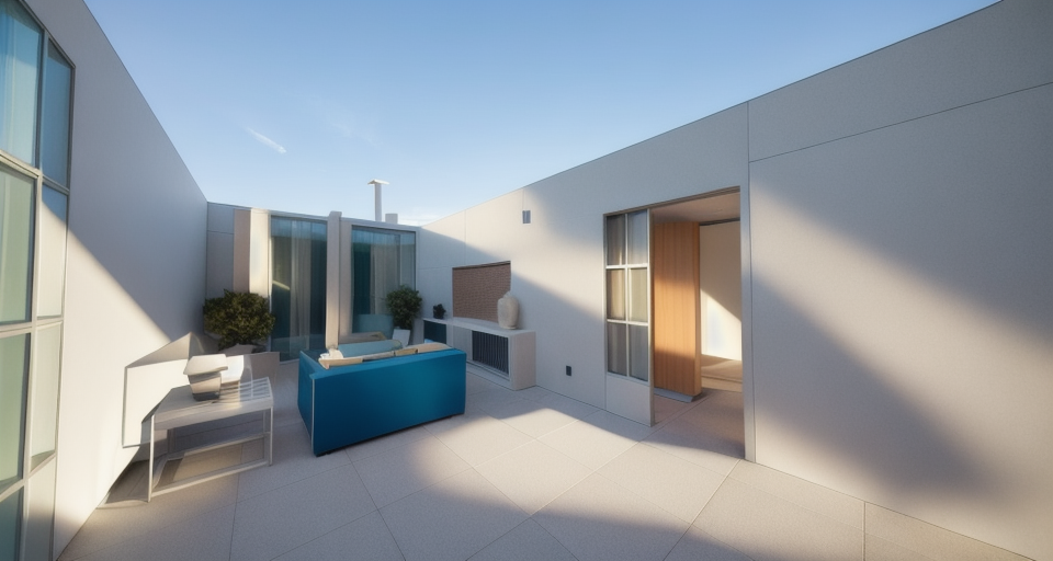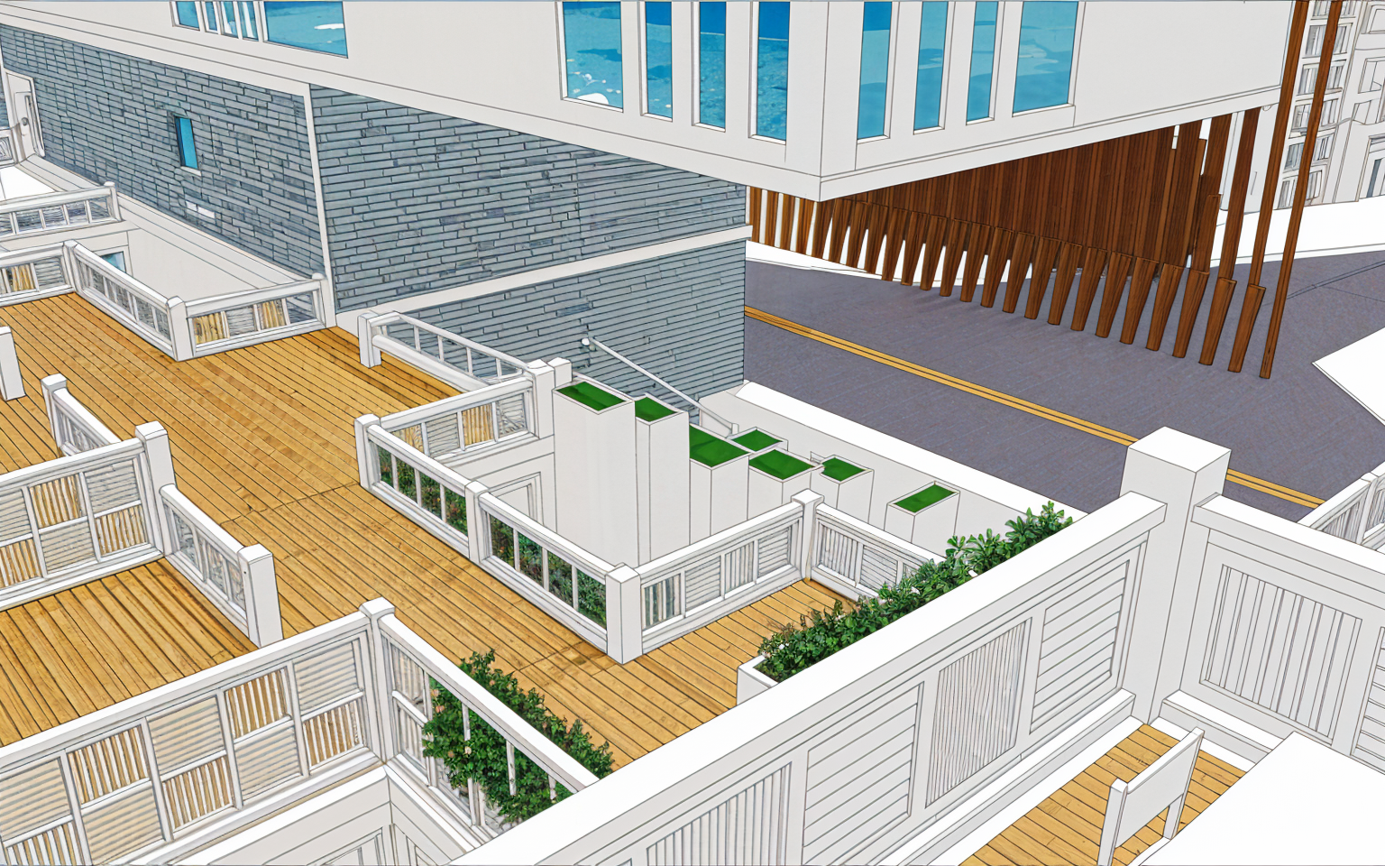 render the rest of the image to a realistic quality should be wooden railings around the wood plaza floor