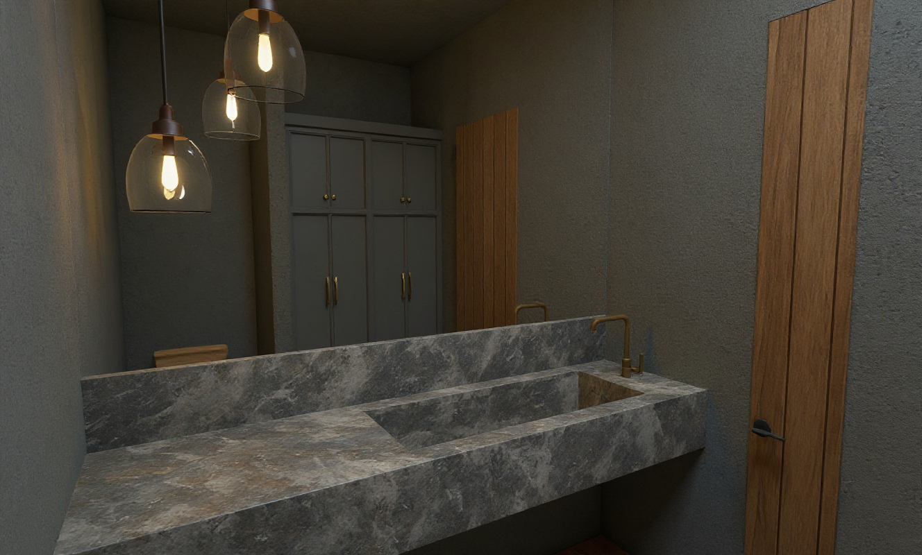 render this in a photorealistic way keeping exact details and paint colors walls should look like plaster countertops should be a cielo quartzite