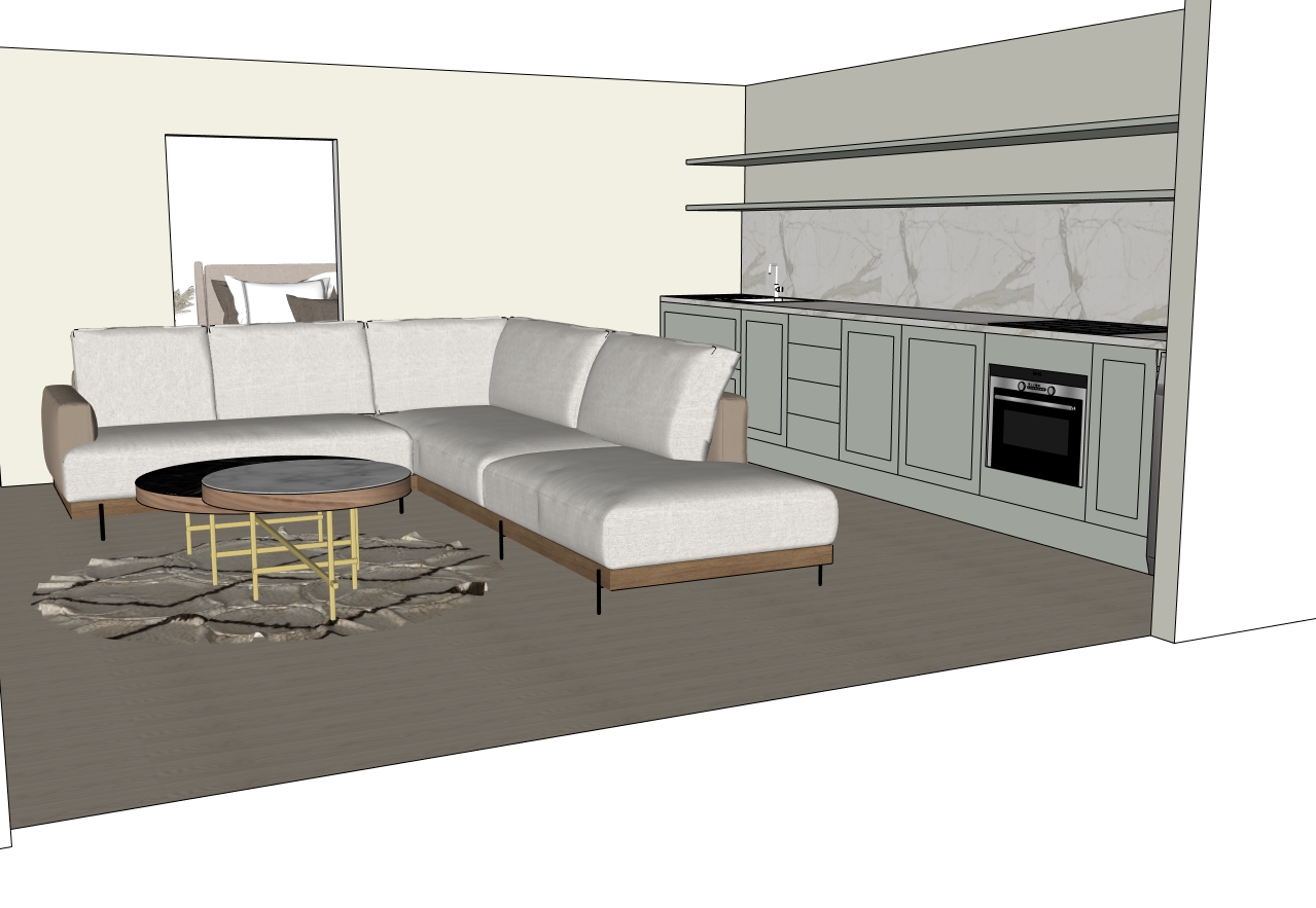 minimalism interior shot a modern living room with a cozy atmosphere a large sectional sofa in soft beige fabric with light brown armrests a round coffee table with a black marble top and a wooden base supported by golden legs a contemporary rug with abstract patterns in shades of gray and beige the kitchen features pale sage green cabinets with a sleek marble backsplash the walls are painted a warm off white dark wood flooring adds contrast and warmth natural light floods through a large window enhancing the airy and welcoming ambiance architecture