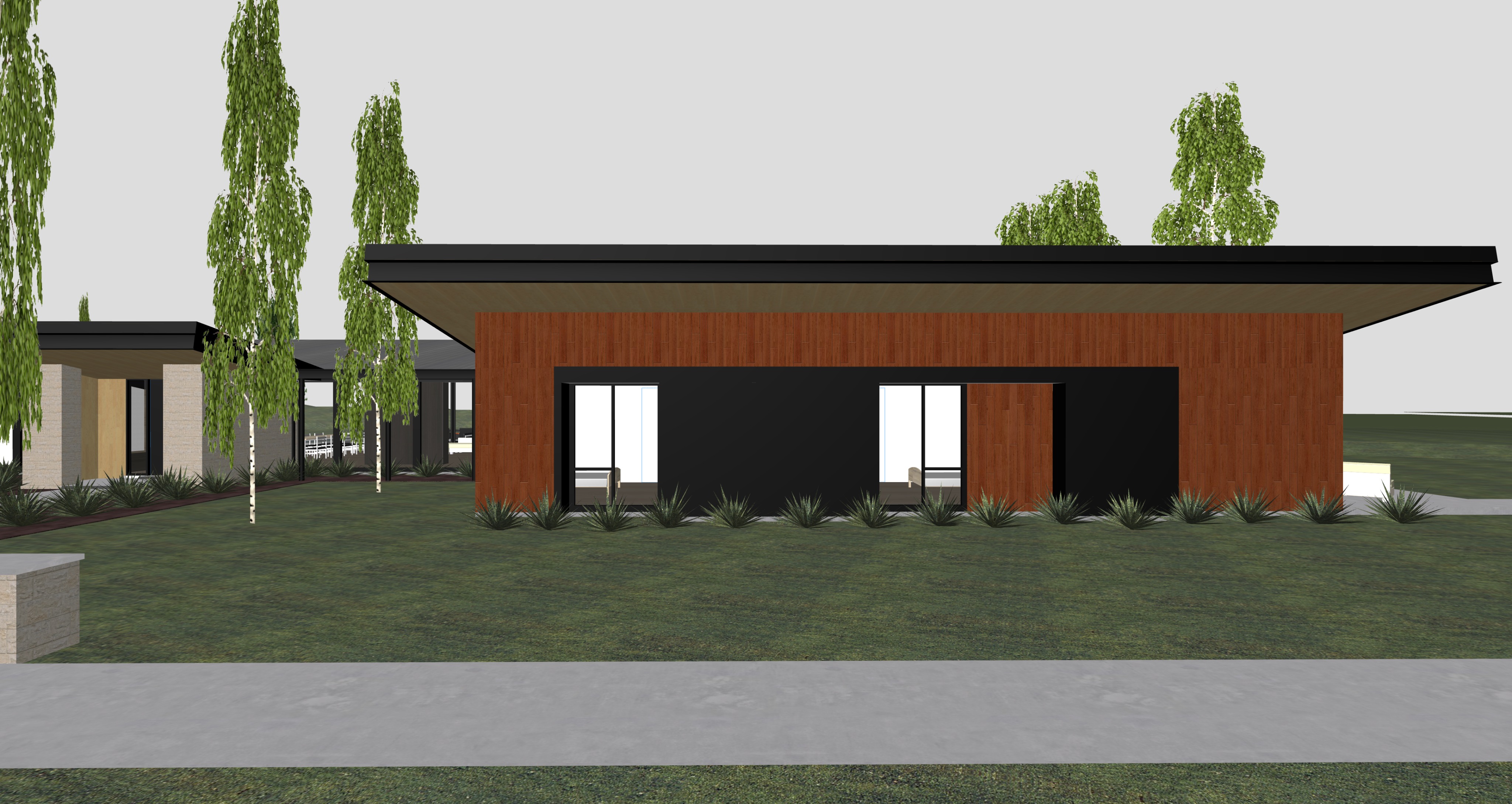 teton mountain range in background grass in green areas improved aspen trees dotting site pines refined furniture in windows bushes and plants next to edges of building very light tan wood plank soffit dark brown and reddish plank siding