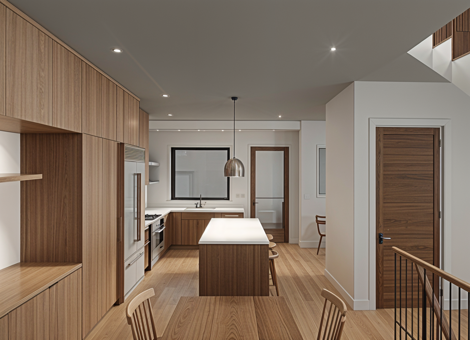 contemporary exterior shot render a modern and luxurious two story house with a minimalist design the walls are made of light beige stone with sleek black framed windows the garage door is wooden with horizontal panels colored in rich walnut brown the entrance features tall elegant pillars of light stone with soft yellow lighting from above creating a warm and inviting atmosphere a lush lawn in vibrant green spreads across the front yard bordered by small neatly trimmed shrubs the sky is a clear blue with soft white clouds evoking a calm and serene ambiance at sunset architecture