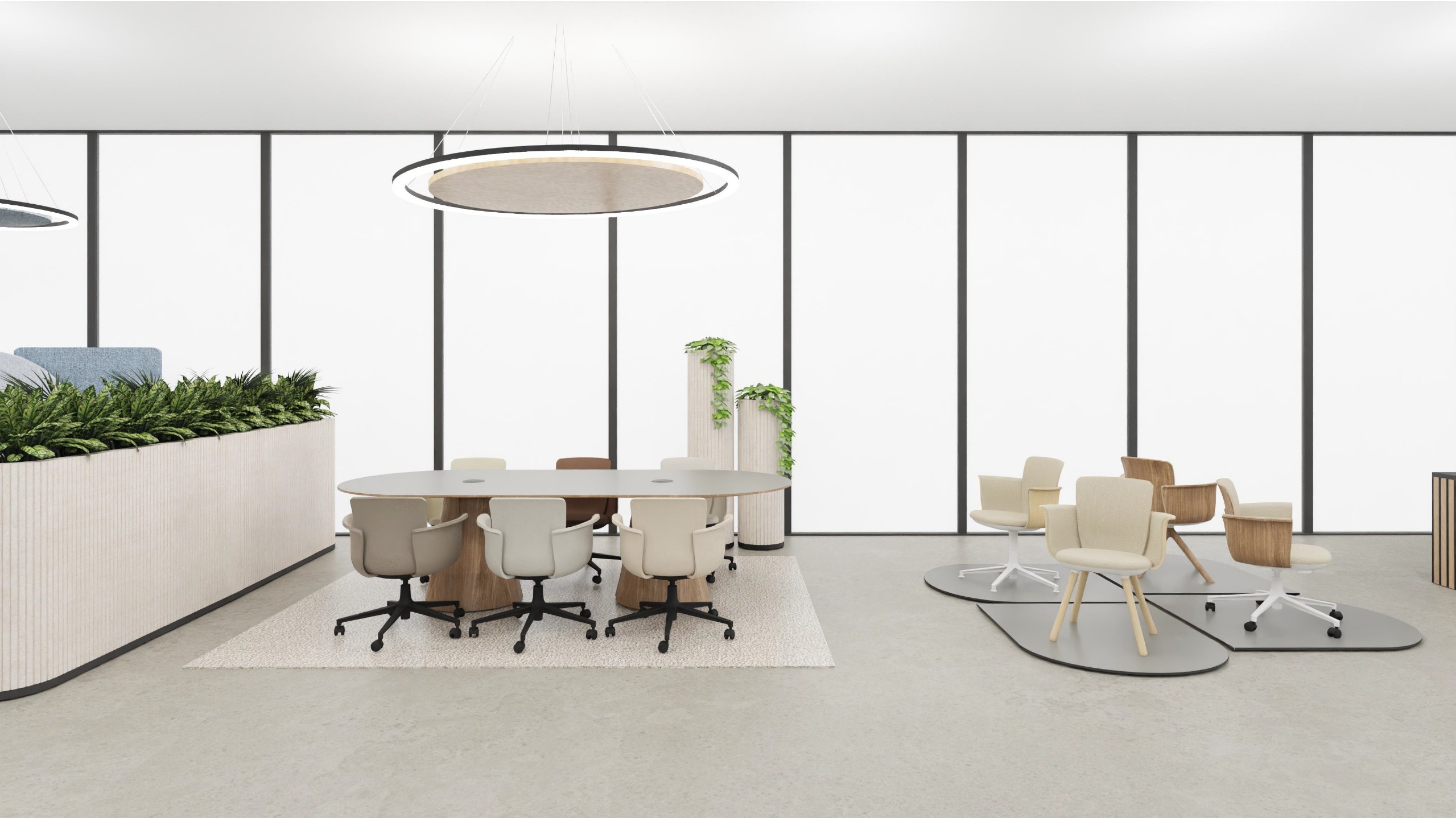 make this look photorealistic with space full of people and a nice fulton market chicago view in the windows in is a day time