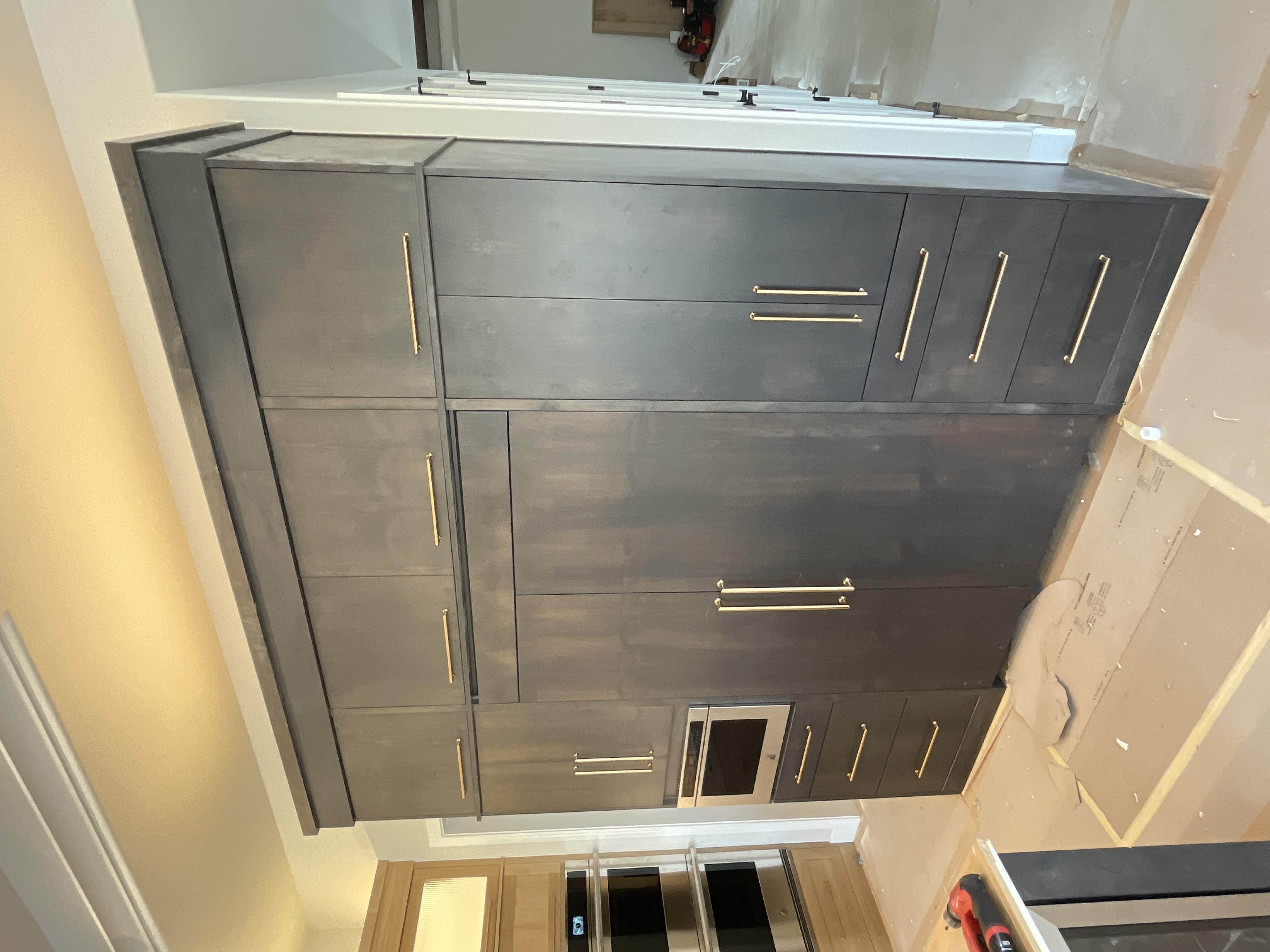 do not change the cabinets in any way preserve the exact cabinet colors materials finishes dimensions door and drawer styles hardware spacing alignment and all geometry exactly as shown do not alter the countertop shape backsplash appliances flooring lighting fixtures or wall structure only remove the construction materials clutter and mess from the scene clean the room and make it look finished and staged add a few simple tasteful home accessories appropriate for the style of the space but do not add or remove any furniture windows or architectural elements maintain the original lighting direction and realism enhance clarity and polish the photo while keeping the cabinetry and room design completely unchanged do not alter the lighting to keep the cabinet colors as they are in the image add new flooring