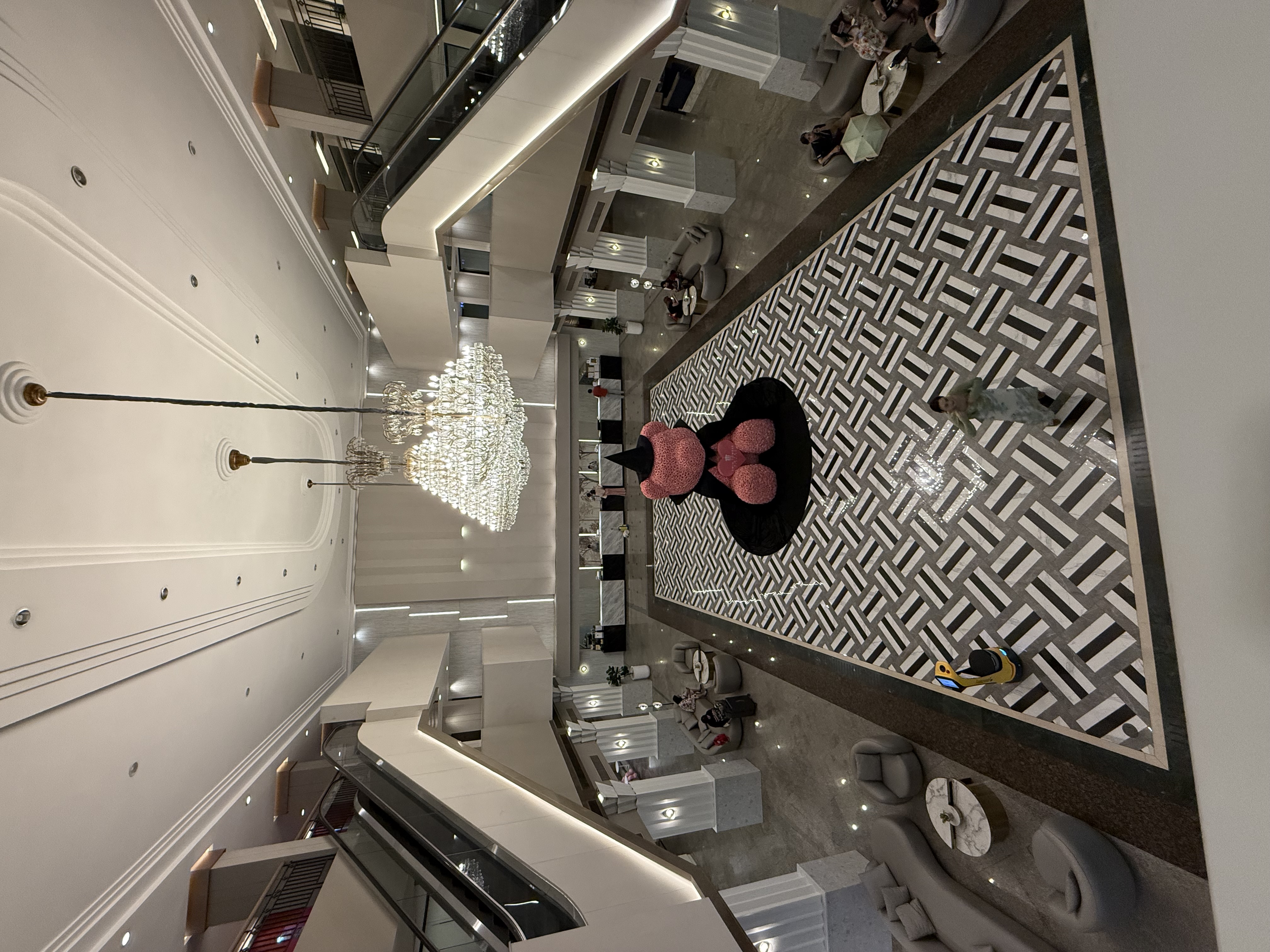 zaha hadid interior from the top render a spacious atrium with a glass ceiling allowing soft natural light to flood the space creating a bright airy atmosphere the surrounding walls are adorned with sleek modern windows framed in dark metal incorporate warm earthy tones for the walls and floor with subtle reflections on the polished stone flooring add greenery and vibrant plants along the sides for a touch of nature capture the dynamic energy of people interacting in this inviting contemporary environment architecture