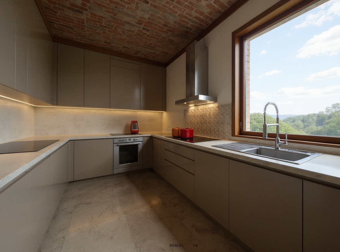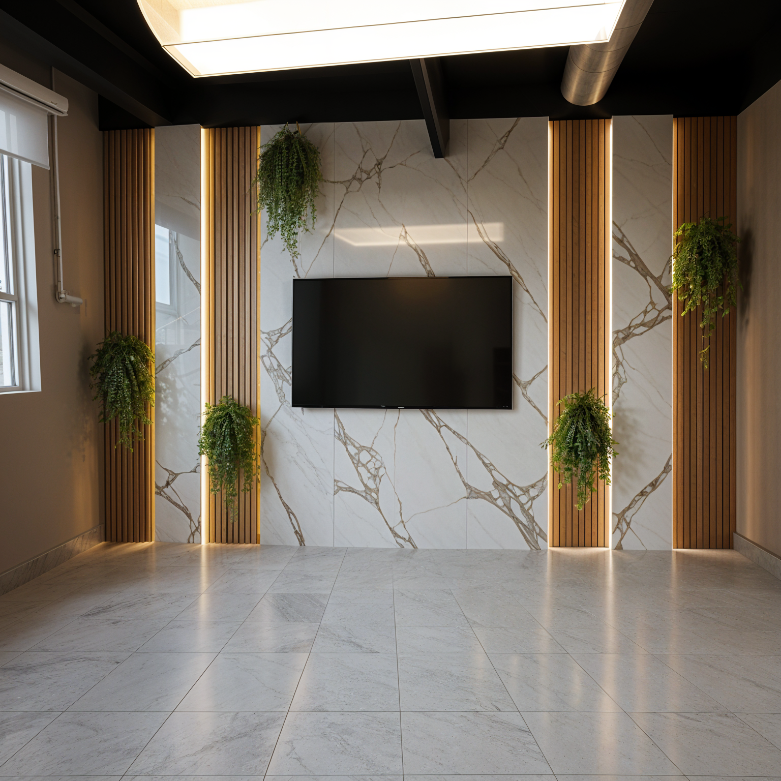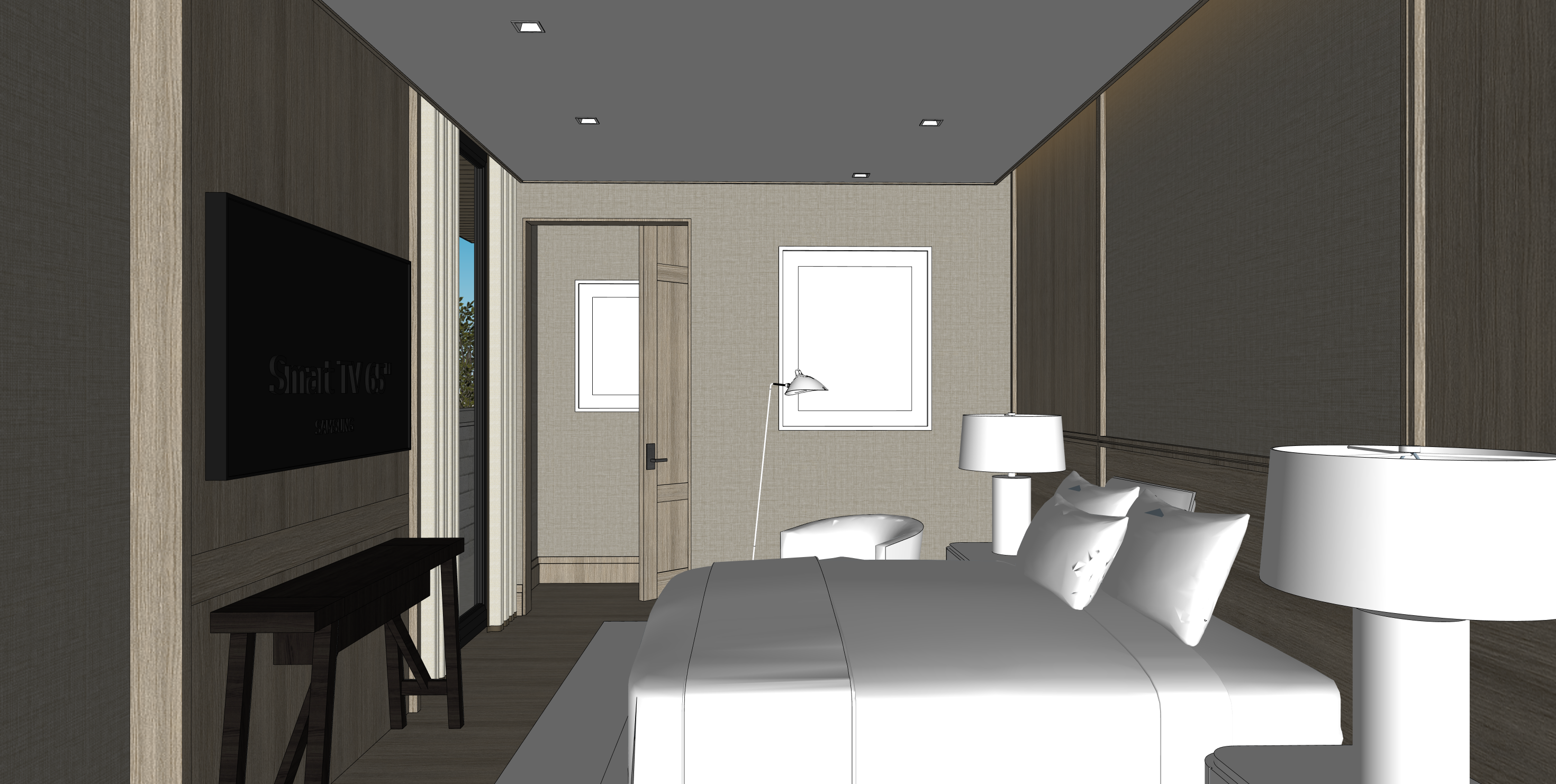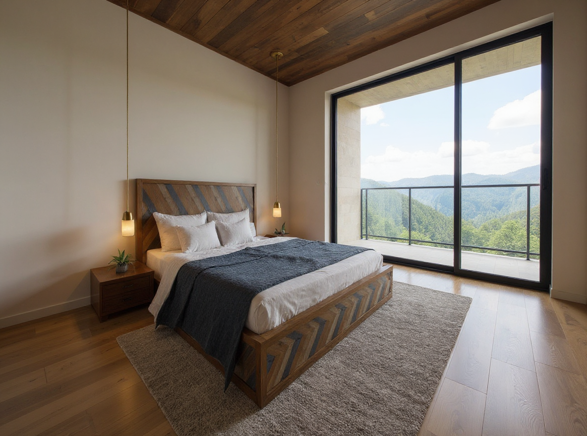render a modern bedroom with a cozy and elegant atmosphere the walls are a soft taupe with a subtle texture complementing the warm wooden panels and door the ceiling is a smooth charcoal grey highlighting recessed ceiling lights for a soft ambient glow the large plush bed is draped with crisp white linens and accented by two fluffy pillows a sleek black flat screen tv is mounted on the wall above a dark wood console table a contemporary floor lamp with a sleek metal design stands next to a comfortable minimalist armchair a large window lets in natural light enhancing the serene and sophisticated vibe of the room