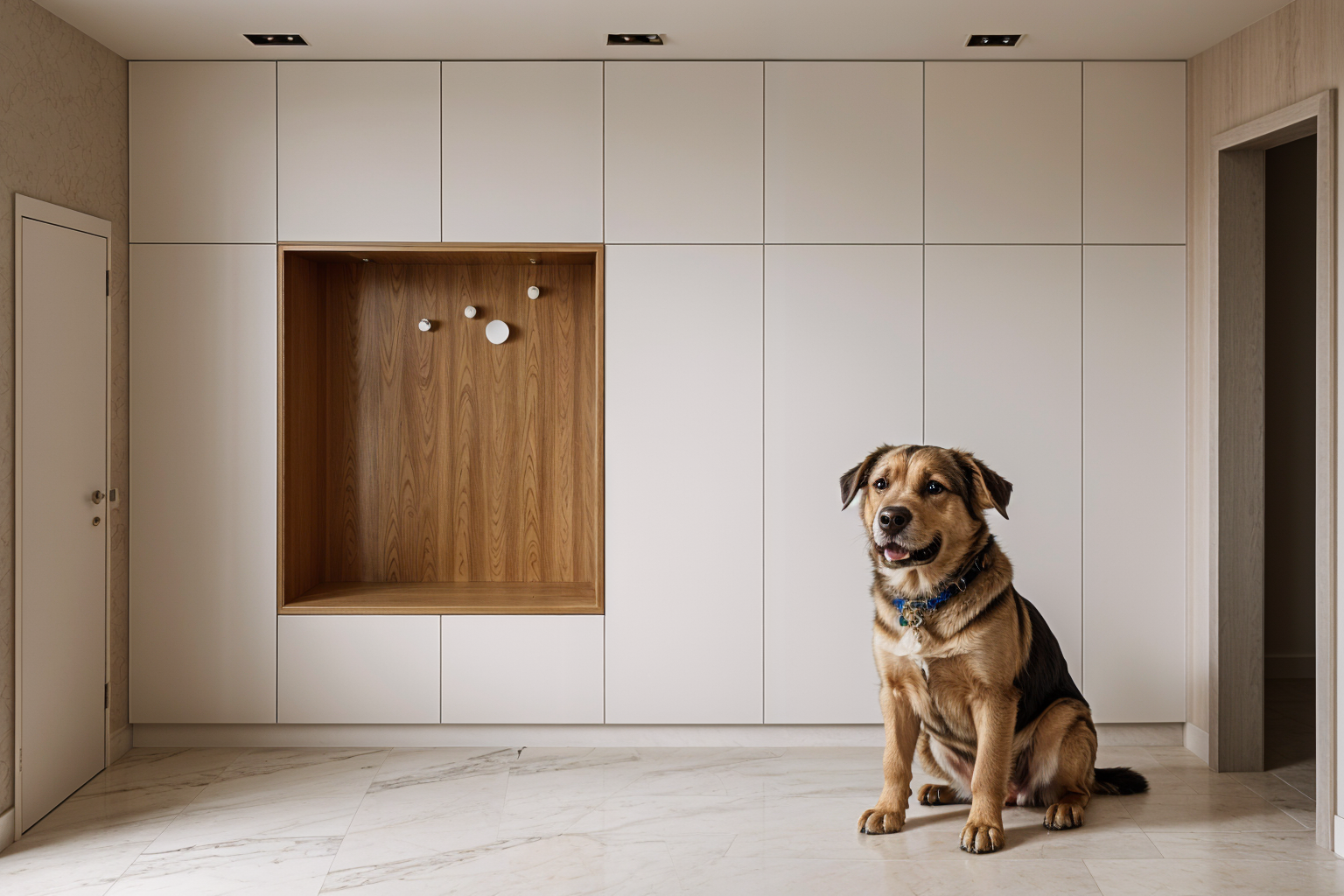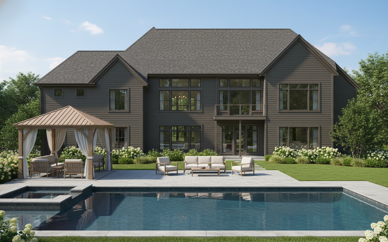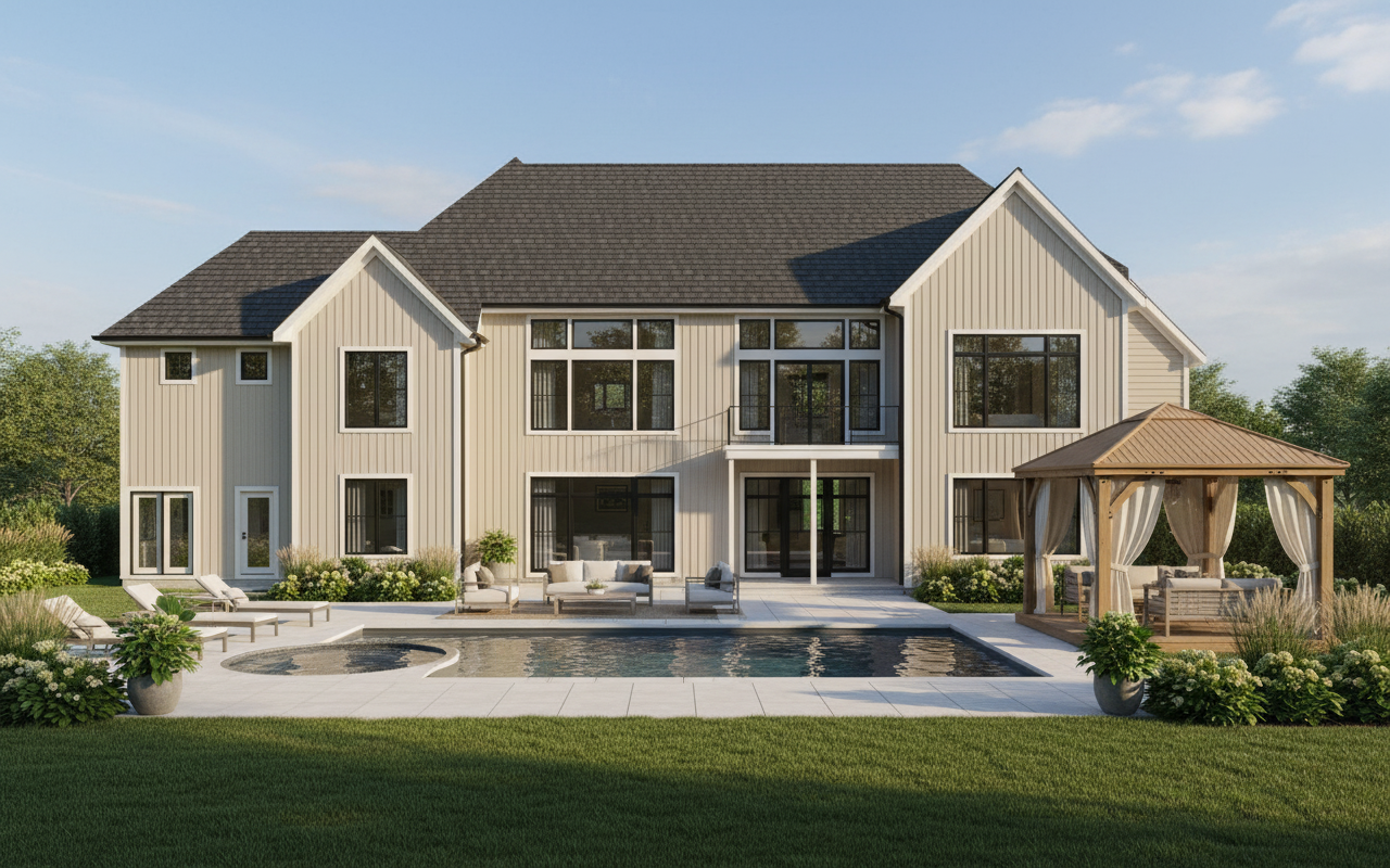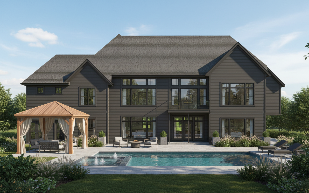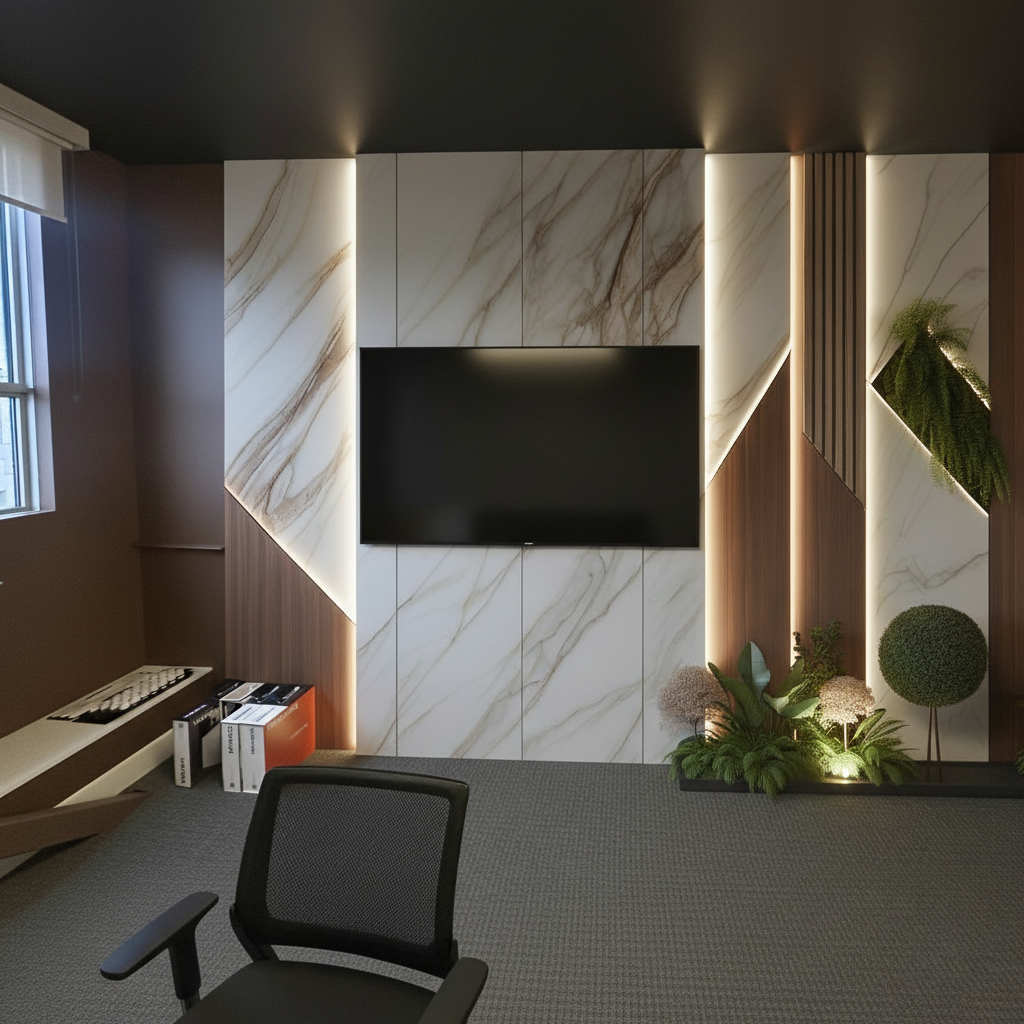 render a modern bedroom with a cozy and elegant atmosphere the walls are a soft taupe with a subtle texture complementing the warm wooden panels and door the ceiling is a smooth charcoal grey highlighting recessed ceiling lights for a soft ambient glow the large plush bed is draped with crisp white linens and accented by two fluffy pillows a sleek black flat screen tv is mounted on the wall above a dark wood console table a contemporary floor lamp with a sleek metal design stands next to a comfortable minimalist armchair a large window lets in natural light enhancing the serene and sophisticated vibe of the room