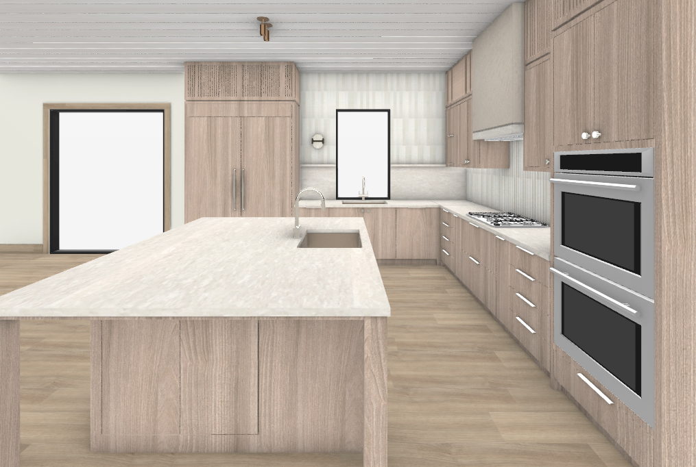 render a photorealistic 3d perspective of this kitchen in a muskoka ontario reference the current material style just enhance them light oak floors and trims light oak reveal baseboards light beige matte quartz countertop vertical backsplash tiles light cream color polished nickel faucet and cabinet handles very small oval sconce on left of the sink in cream stone and bronze frame keep geometry and materials light beige plaster hood fan with a reveal and stone trim below it white wood ceiling finish keep model geometry the same windows doors cabinets walls wall tiles kitchen island wall sconce ceiling light stone backsplash stone shelf hoodfan add a lake view to kitchen windows native to muksoka ontario add a few neutral accessories yo kitchen island and kitchen counter do not change the view only enhance the current materials and make the lighting more natural detailed textures atmospheric depth render in hyper realistic architectural visualization quality 8k resolution