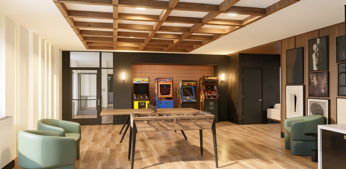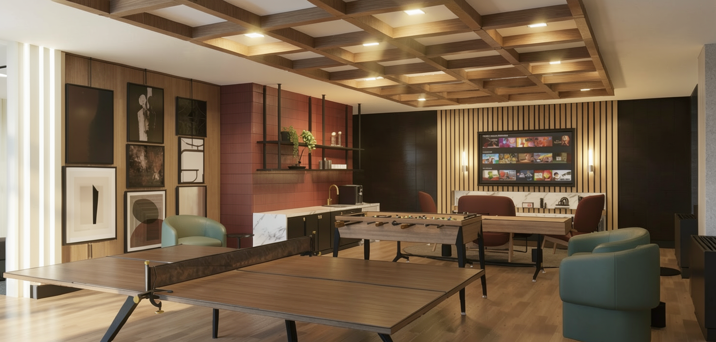 a modern two story house retain the exact structure colors and window arrangement rooflines siding foundation height porches and proportions exactly as shown in the reference image all roofs are black metal as shown integrate into the terrain there is a lush dense forest of mixed hardwoods that further back behind the structure add cooler afternoon sunlight subtle dappled highlights across the siding and grass create ultra realistic lighting crisp shadows detailed textures in the siding and glass reflections and an overcast sky show only a few lights visible inside render in hyper realistic architectural photo visualization quality 8k resolution add a driveway tying into the concrete garage door apron make it the summer season keep cobble sidewalk out front