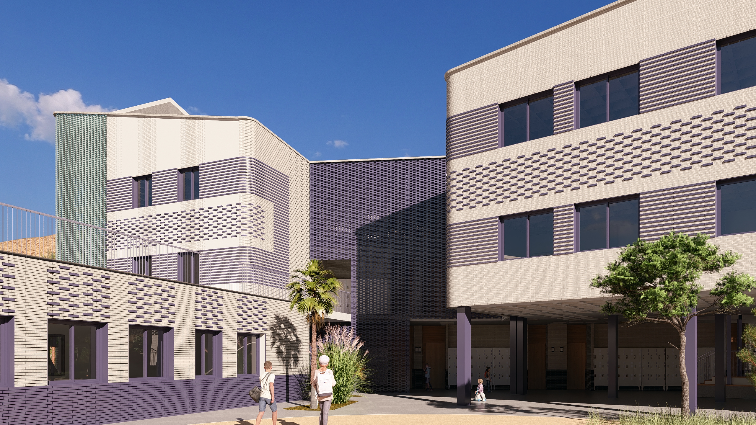 exterior de instituto contempor neo con fachada de ladrillo en tonos grises y azulados composici n existente intacta mantener la geometr a materiales y dise o original sin modificaciones estructurales introducir variaciones m nimas y realistas de color en los ladrillos propias del proceso de fabricaci n ligeras diferencias tonales entre piezas grises azulados matices ligeramente m s c lidos o fr os evitando uniformidad excesiva pero sin cambiar el color global de la fachada mejorar la iluminaci n general luz natural m s rica y equilibrada global illumination realista sombras suaves y coherentes mayor rango din mico hdr resaltando la textura del ladrillo y el volumen arquitect nico sin sobreexponer a adir en planta baja adolescentes realistas entrando y saliendo del edificio peque os grupos conversando otros caminando con mochilas comportamiento natural y escala correcta integrarlos de forma sutil sin robar protagonismo a la arquitectura estilo fotorrealista render arquitect nico materiales pbr texturas detalladas reflejos controlados exposici n equilibrada c mara a nivel de calle lente 28 35 mm composici n limpia