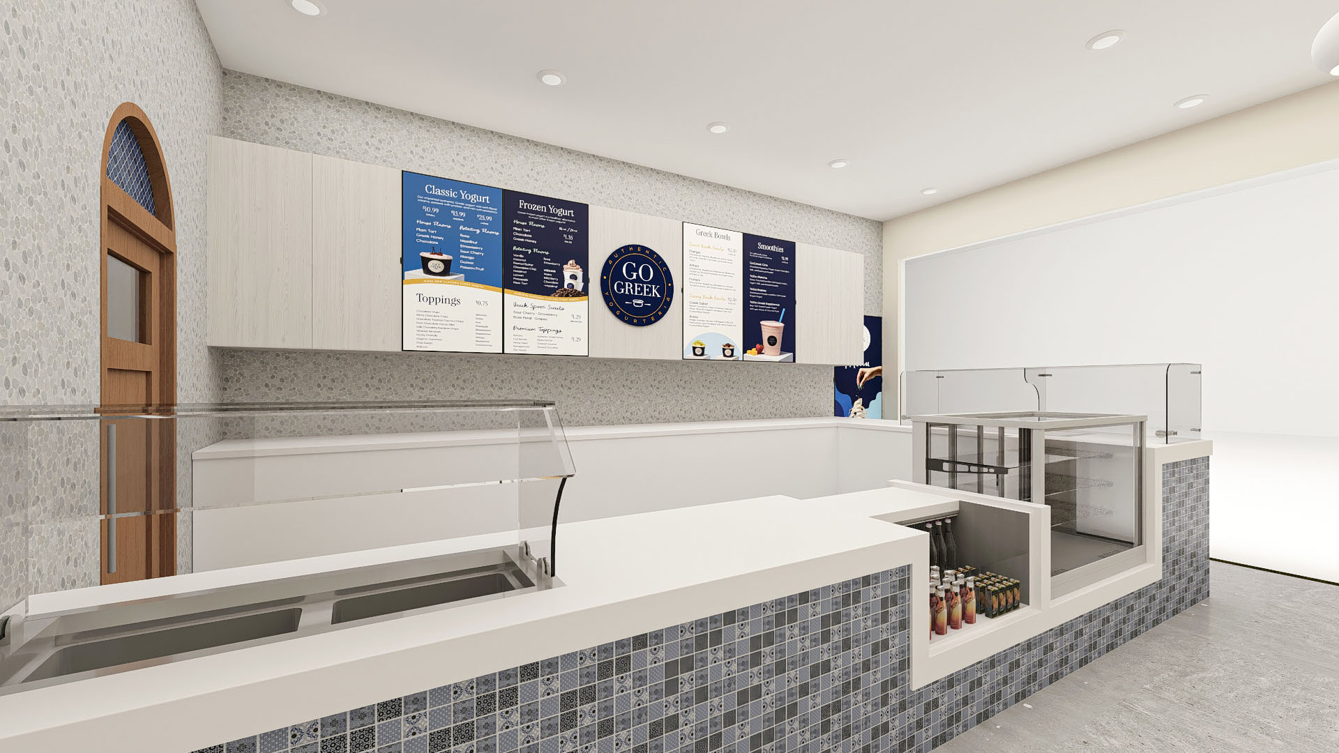 this is a yogurt shop inside of a mall make it look like a mall as you look out into that white void don t change anything else about the image